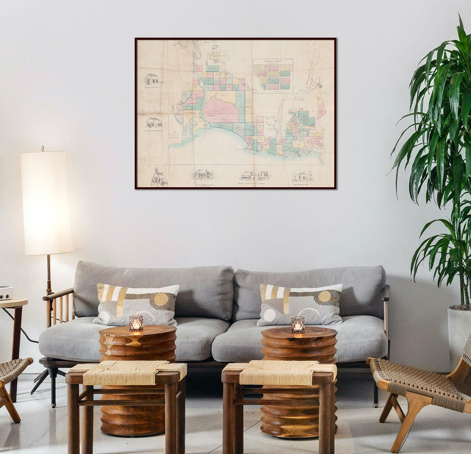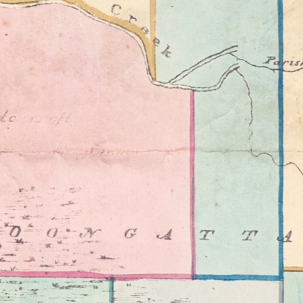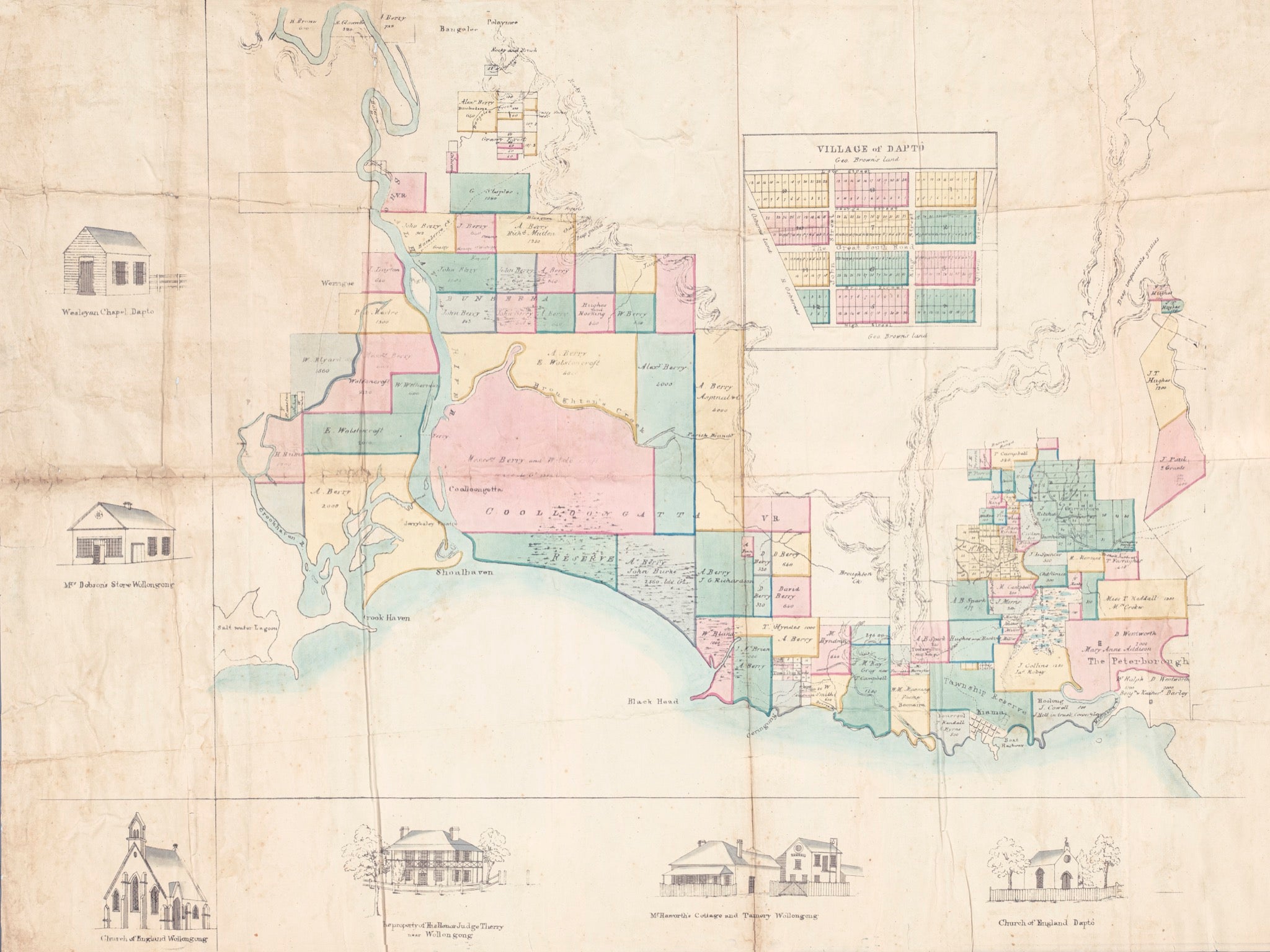 1840s rare map showing early European settlement, including landholdings and historic buildings around Illawarra..