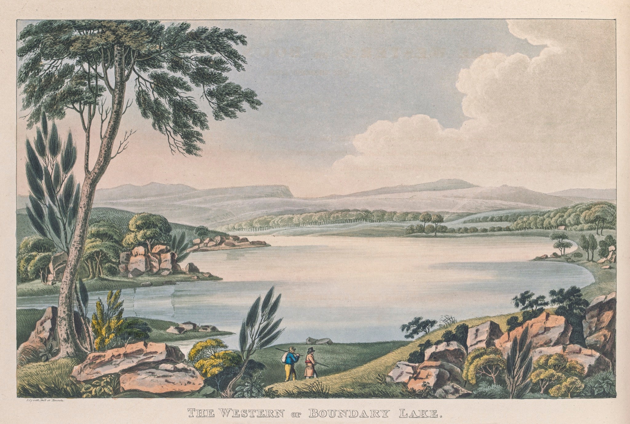 From Joseph Lycett's: Views in Australia, or, New South Wales & Van Diemen's Land delineated, in fifty views with descriptive letter press : dedicated by permission to the Right Honble. Earl Bathurst, 1824-1825..Lake Sorell, Tunbridge area, Tasmania Midlands