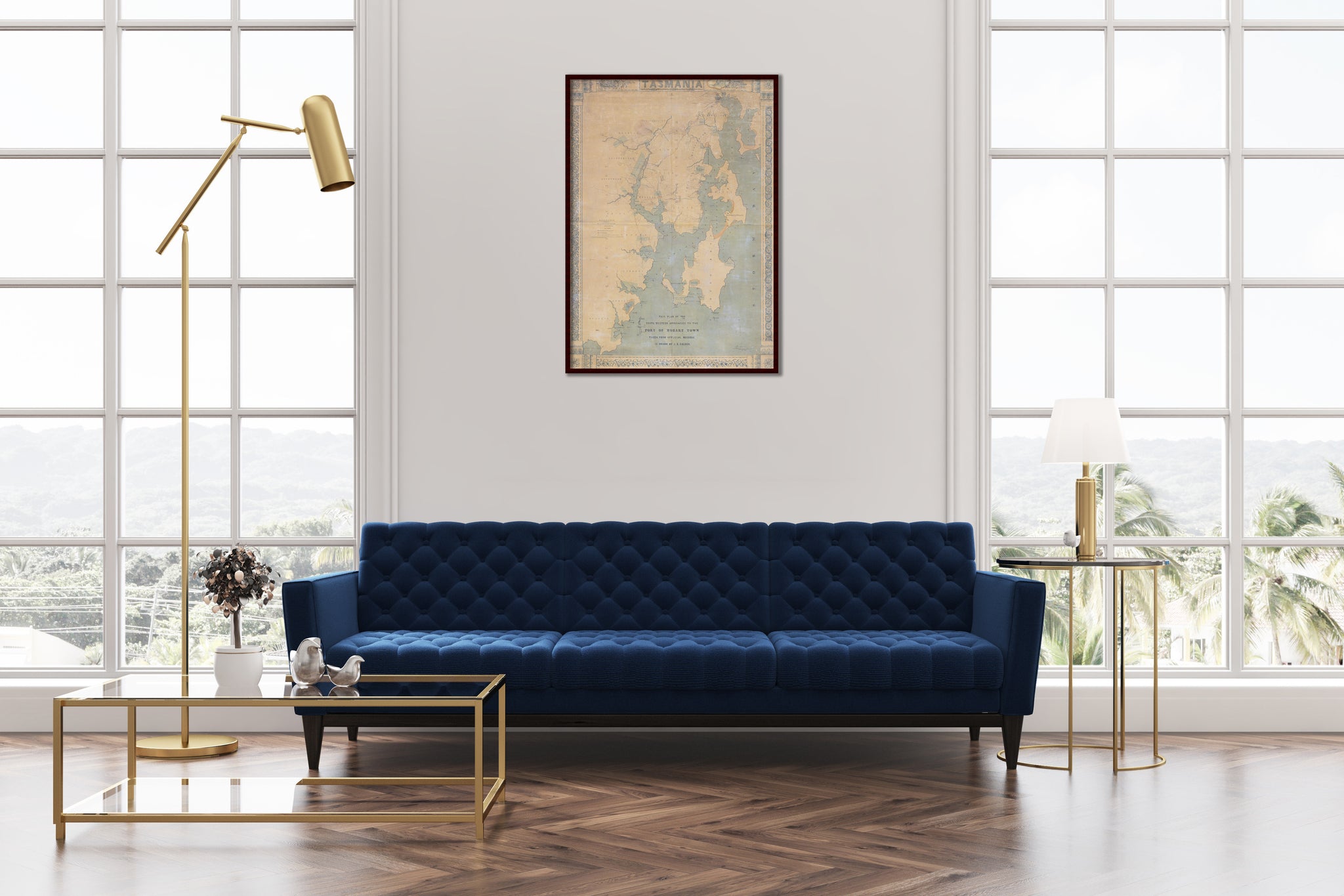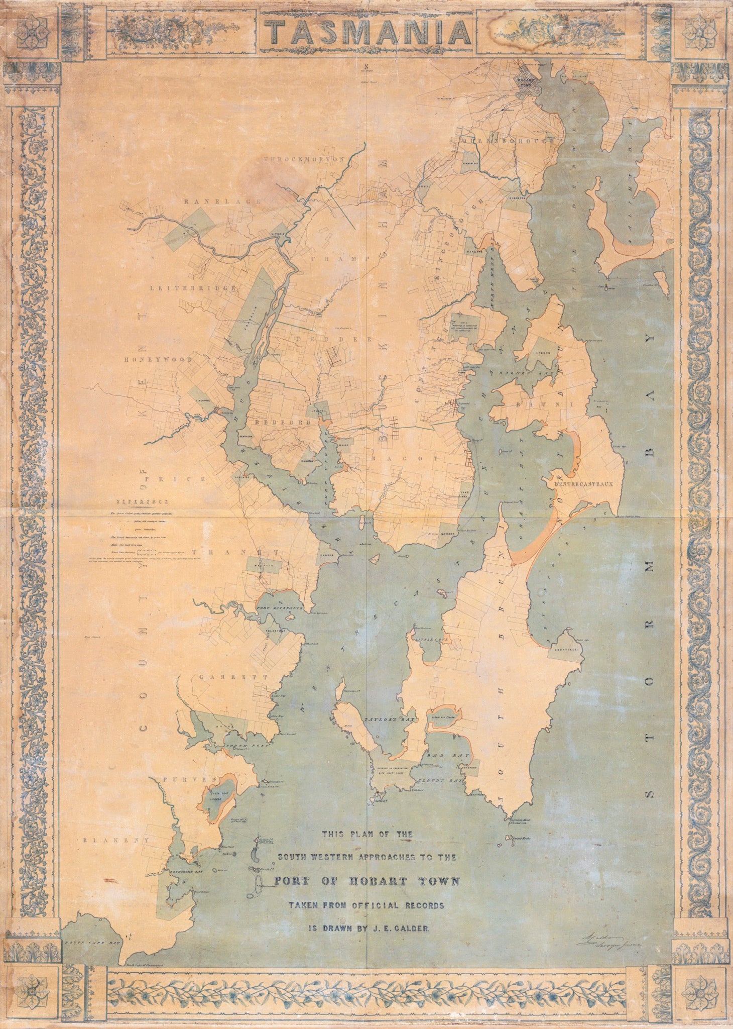 'This Plan of the Western Approaches to the Port of Hobart Town taken from Official Records is Drawn by J. E. Calder Circa 1860.A large map showing private property, old surveyed lands, townships and Parish boundaries with fine decorative border..(National Library of Australia)