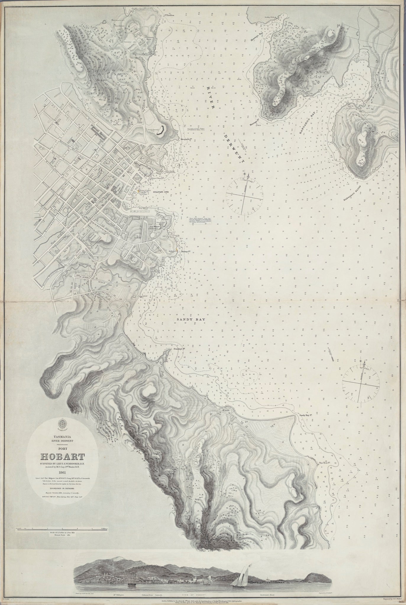 British hydrographic chart with soundings in fathoms, published at the Admiralty 1863. A large finely detailed map of the River Derwent and Port of Hobart, with a sketch vignete of Hobart Town, Tasmania..(National Library of Australia)
