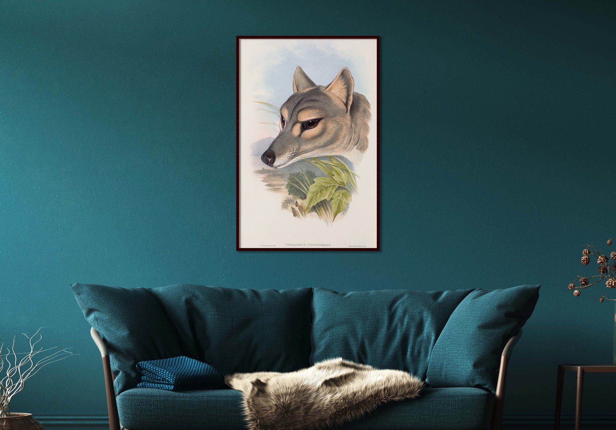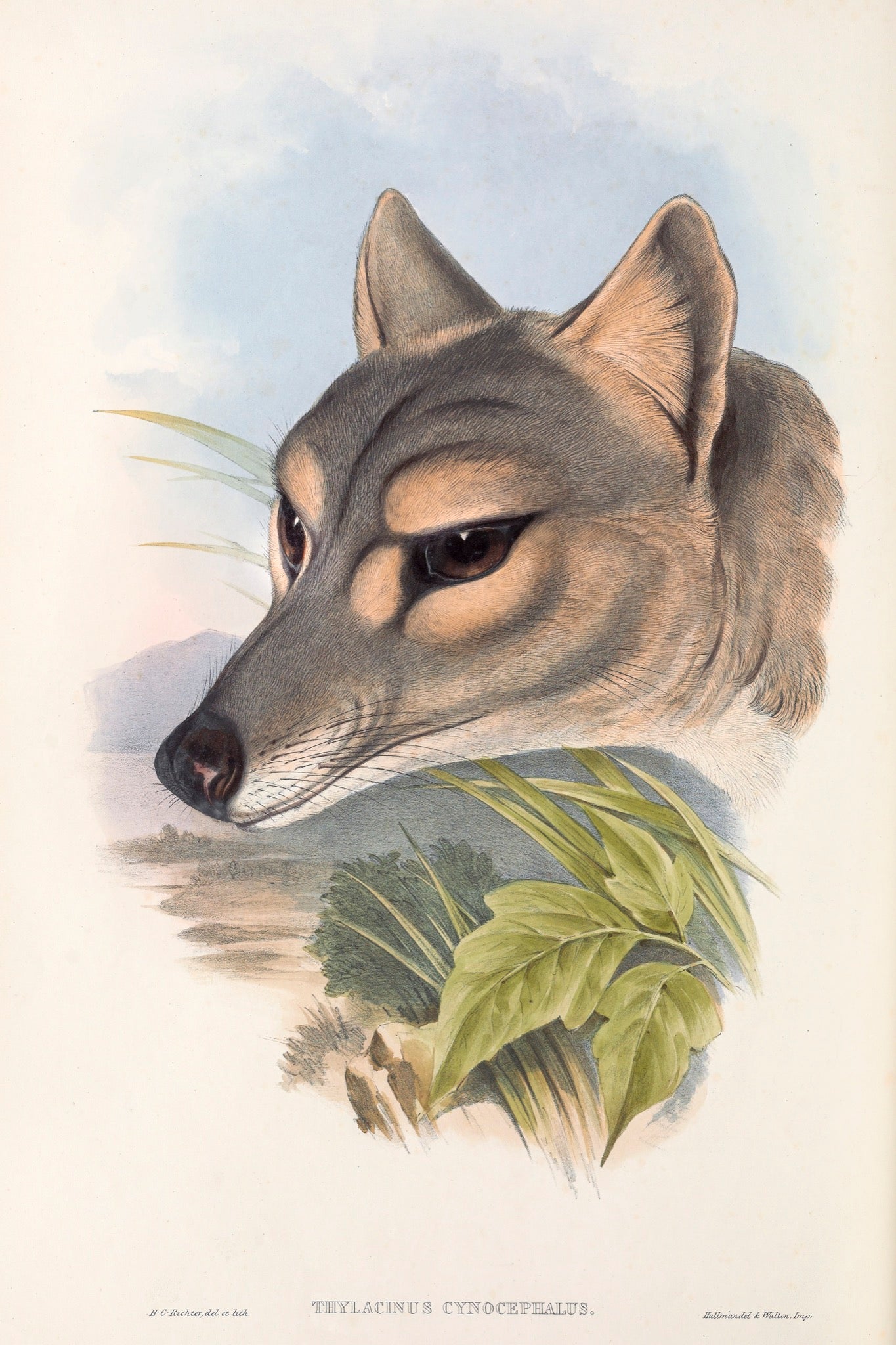 Gould wrote of the Tasmanian Tiger (Thylacinus cynocephalus) in 1863 that: 'When the comparatively small island of Tasmania becomes more densely populated, and its primitive forests are intersected with roads from the eastern to the western coast, the numbers of this singular animal will speedily diminish, extermination will have its full sway, and it will then, like the Wolf in England and Scotland, be recorded as an animal of the past: although this will be a source of much regret, neither the shepherd nor the farmer can be blamed for wishing to rid the island of so troublesome a creature. A price is already put upon the head of the native Tiger...'..By 1936 the last known thylacine was dead. The species was officially declared extinct by the International Union for Conservation of Nature in 1982, following a lack of sightings in the wild for over 50 years.