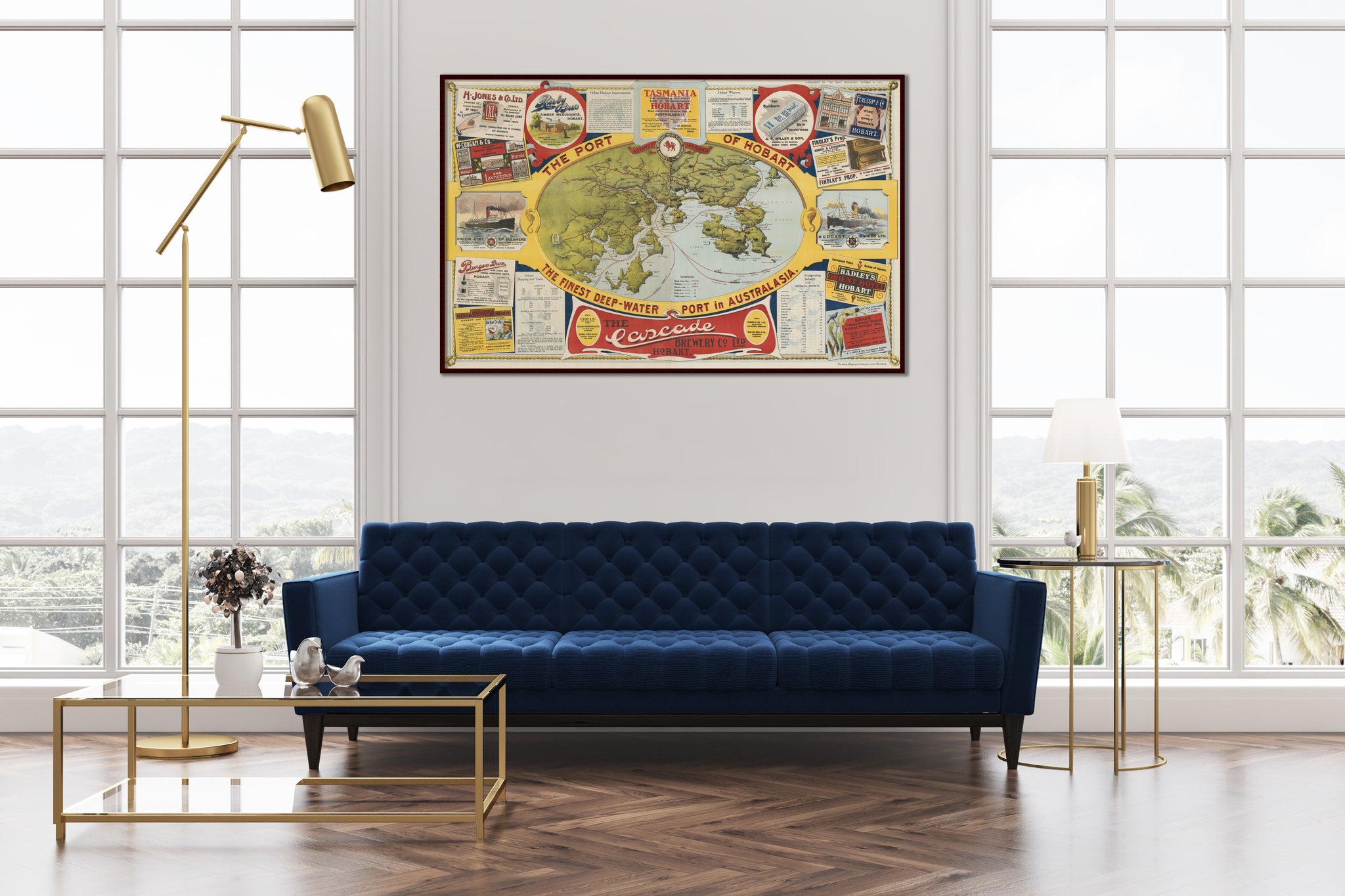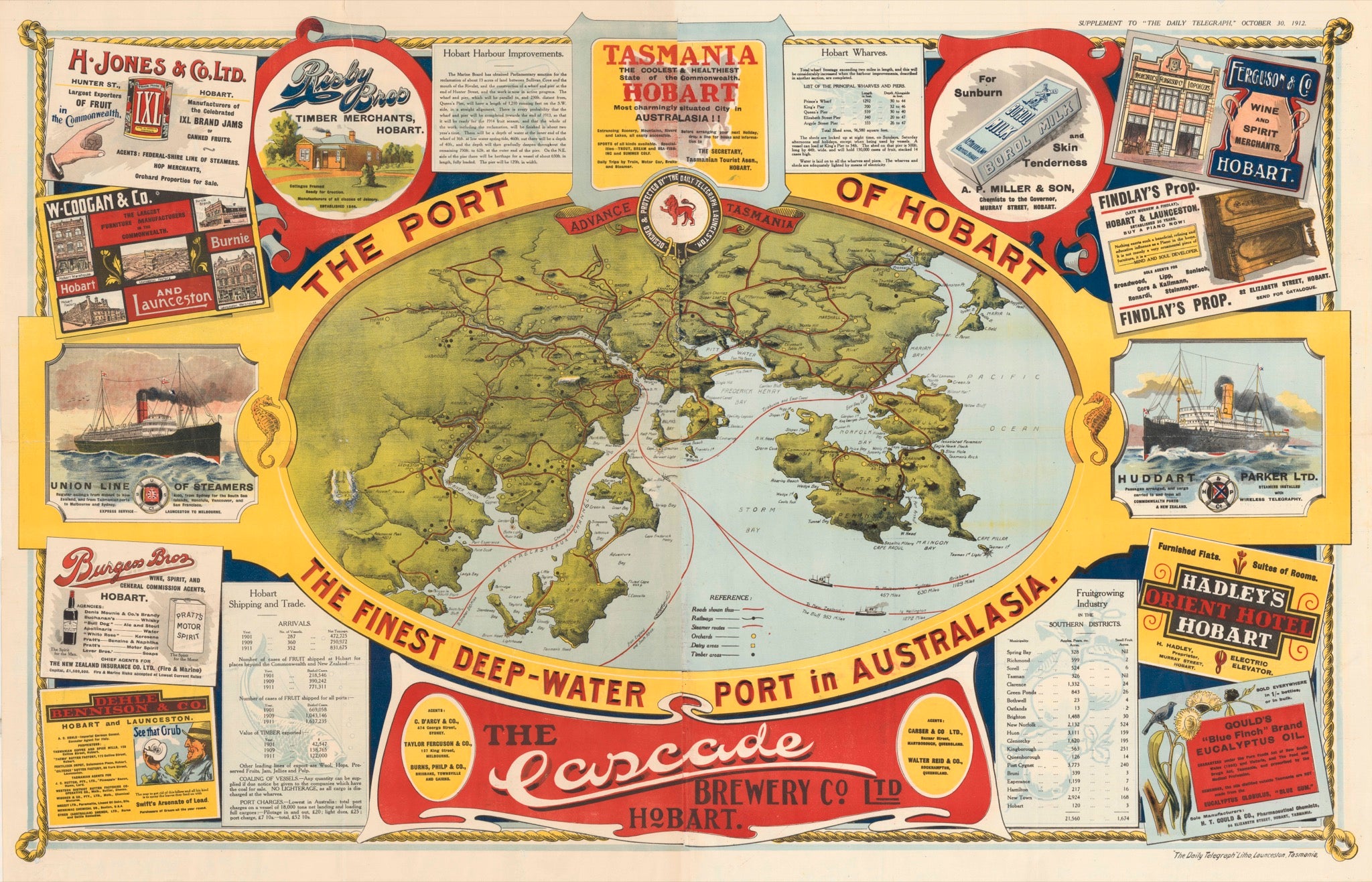 A large, pictorial tourist map of 1912 of Hobart, Tasmania: 'The coolest healthiest State of the Commonwealth. Most charminly situated City in Australasia!! - Entrancing Scenery, Mountains, Rivers adn Lakes... Sports of all kinds... Trout, Bream & Sea Fishing and Summer Golf... - Tasmanian Tourist Assn, Hobart.'..(National Library of Australia)