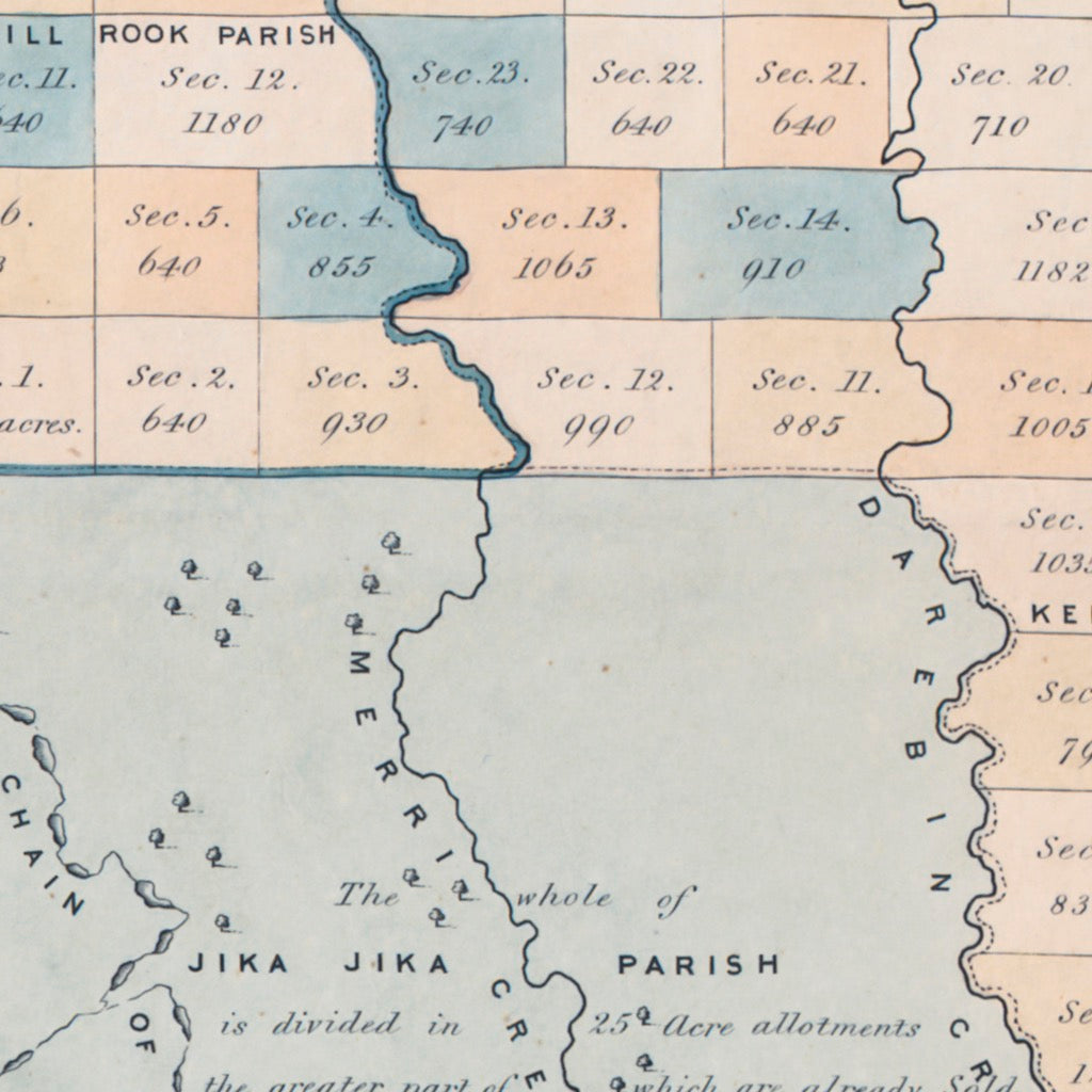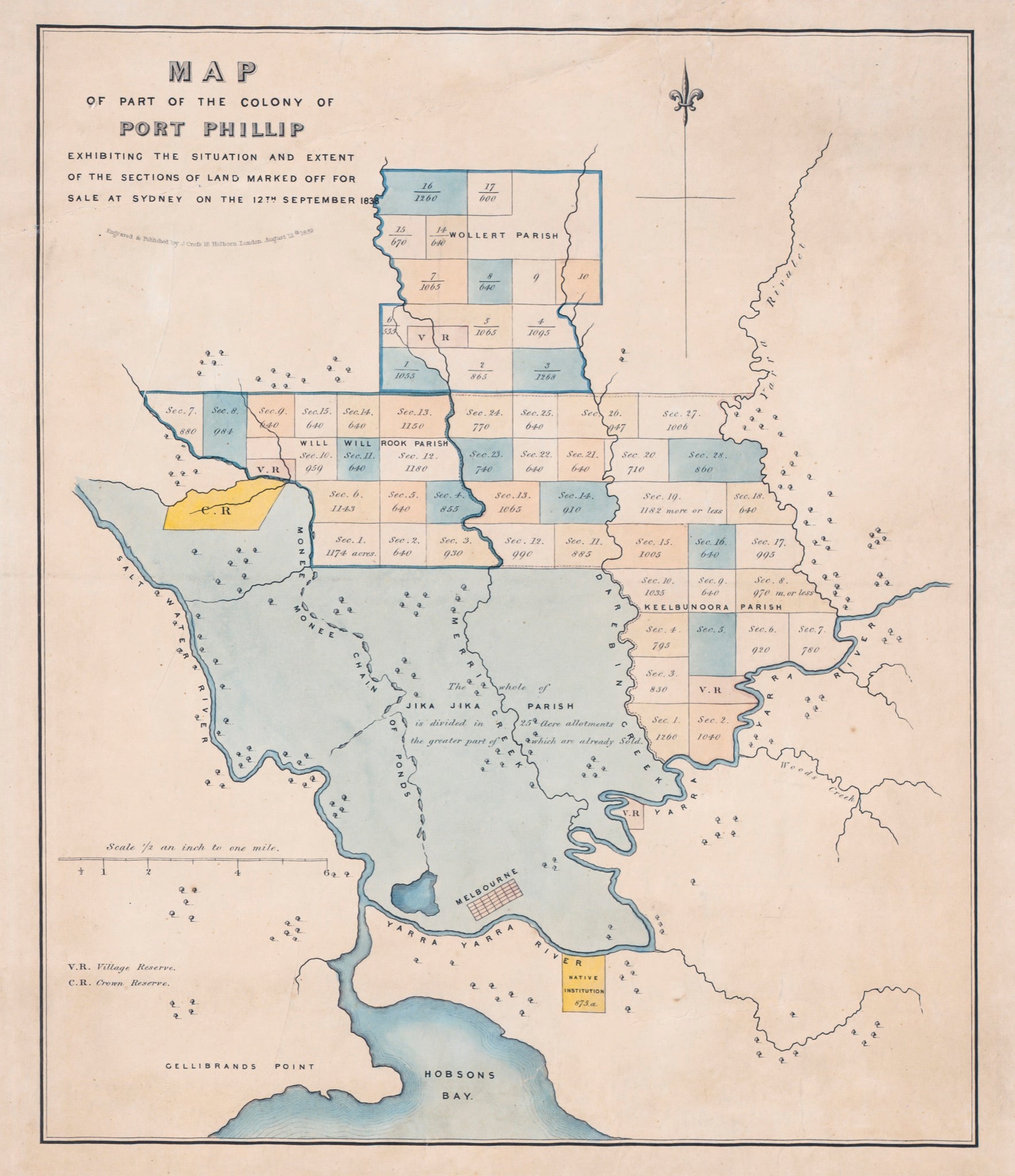 After annulling Batman's 'Treaty' in 1835, this map three years later shows that the Government's plans to settle Melbourne were proceeding apace...Melbourne town can be seen newly laid out on the banks of the 'Yarra Yarra', while large farms are offered to the north for sale, in an area from Tullamarine to Heidelberg. These were quickly bought by Sydney speculators, along the with the area marked blue, 'the greater part of which are already sold' by 1838!..The little 875 acre yellow block labelled 'Native Institution' (located at South Yarra) is a poignant reminder of the iniquitous land 'deal' dealt to the indigenous owners who roamed freely through this country for 40 thousand years, up until just 3 years before the publication of this map...Land grants were administered by New South Wales until 1851, when the self-governing 'Colony of Victoria' was created.
