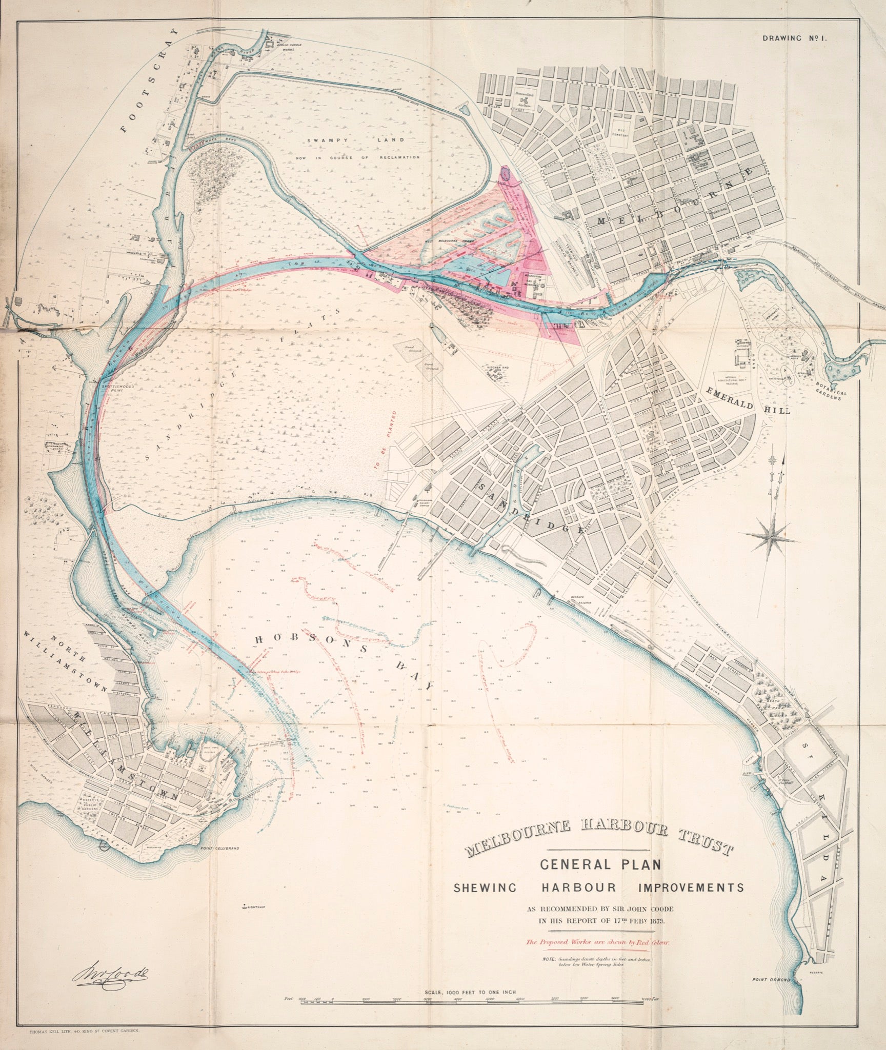 Eminent British harbour engineer Sir John Coode was commissioned by the newly formed Melbourne Harbor Trust (1877) to provide a plan to improve shipping access which involved the challenging task of redirecting the course of the Yarra to build Coode's shipping Canal, build dock facilities. The land was originally a flood plain of swamps, tea tree forest and sand flats.