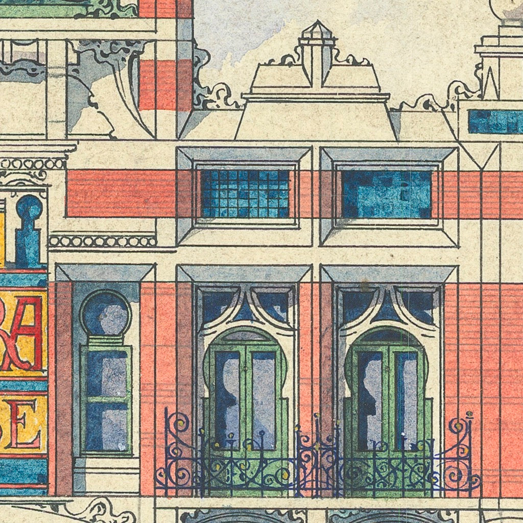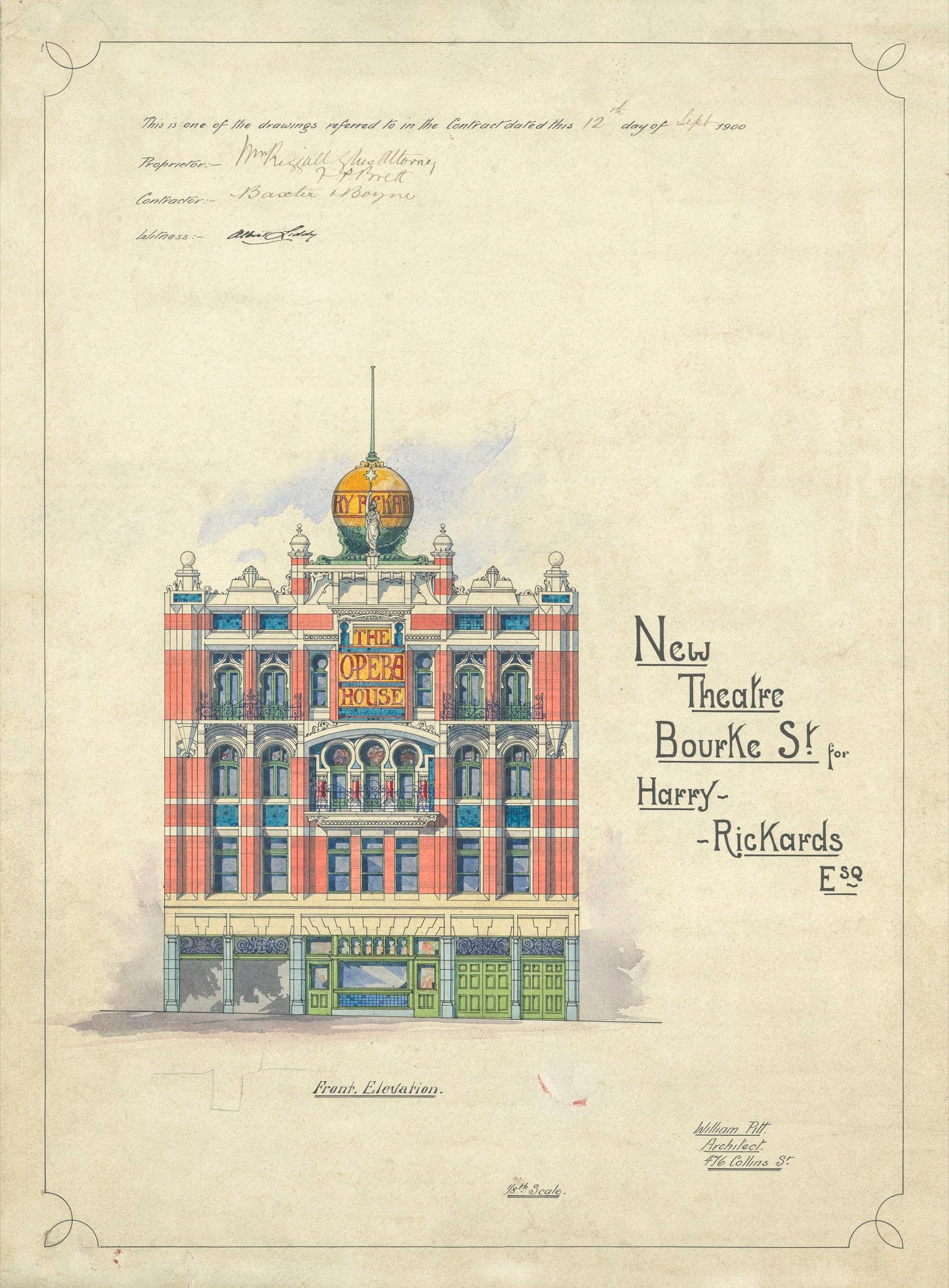 'Architectural drawings of the Opera House later the Tivoli Theatre, Bourke Street Melbourne. The Tivoli, Bourke Street, was built on the site of Prince of Wales Opera House, architect, George Johnson (1872). The name was changed to Her Majesty's Opera House in 1884, then the Alhambra Theatre in 1893. After losing its licence in 1899 the theatre was rebuilt to a design by architect William Pitt and opened as the Opera House on 18 May 1901. It was renamed the Tivoli in 1912'. (State Library of Victoria)