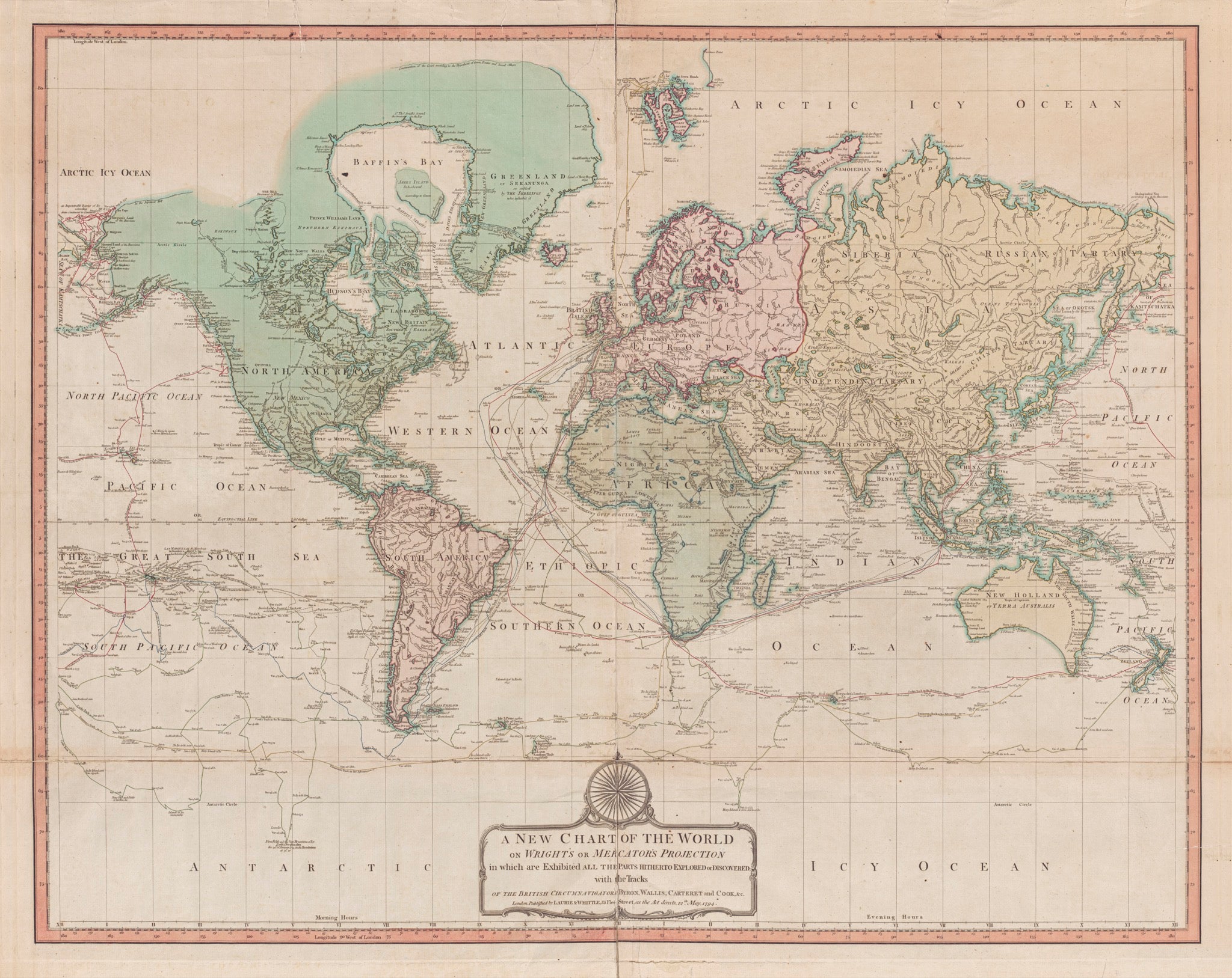 A new chart of the world on Wright's or Mercator's projection in which are exhibited all the parts hitherto explored or discovered with the tracks of the British circumnavigators Byron, Wallis, Carteret and Cook, etc
