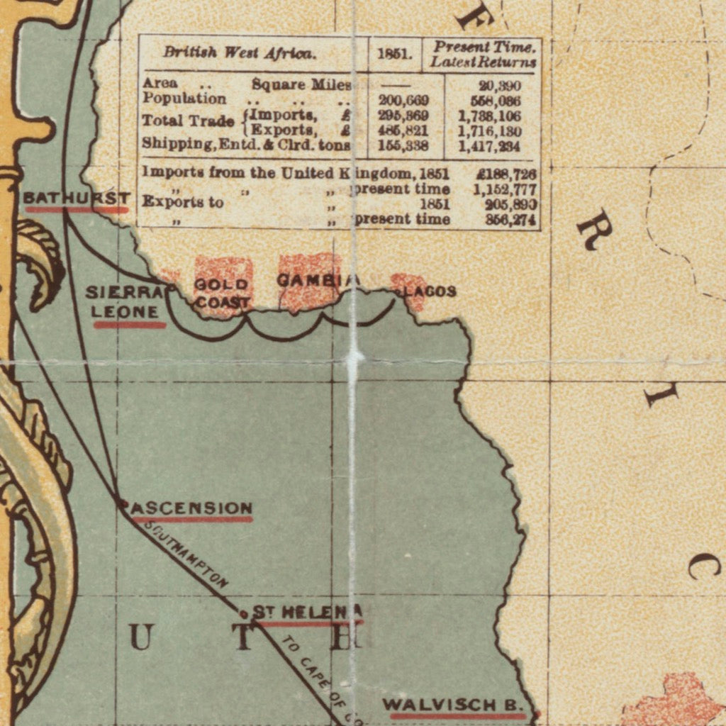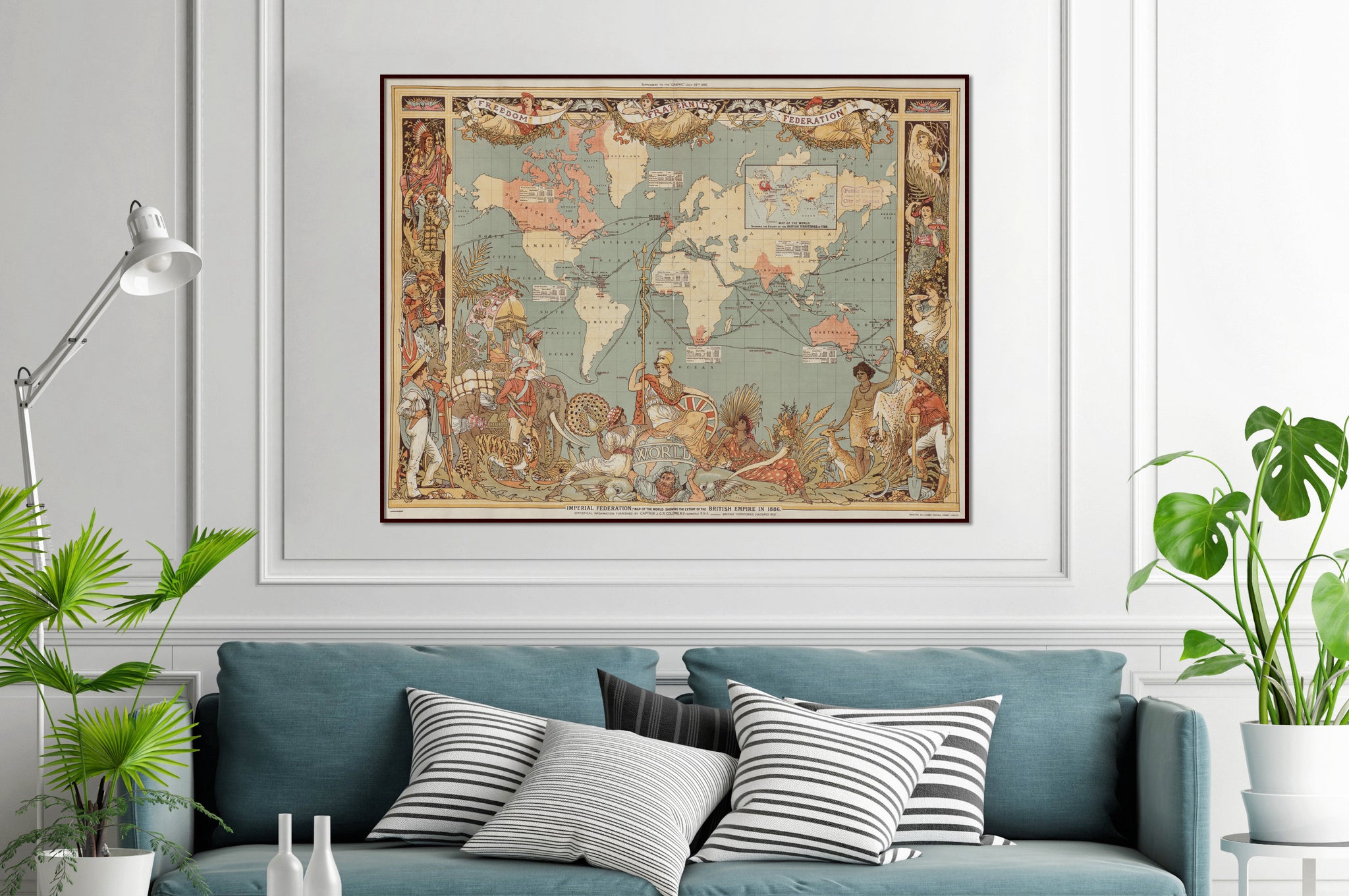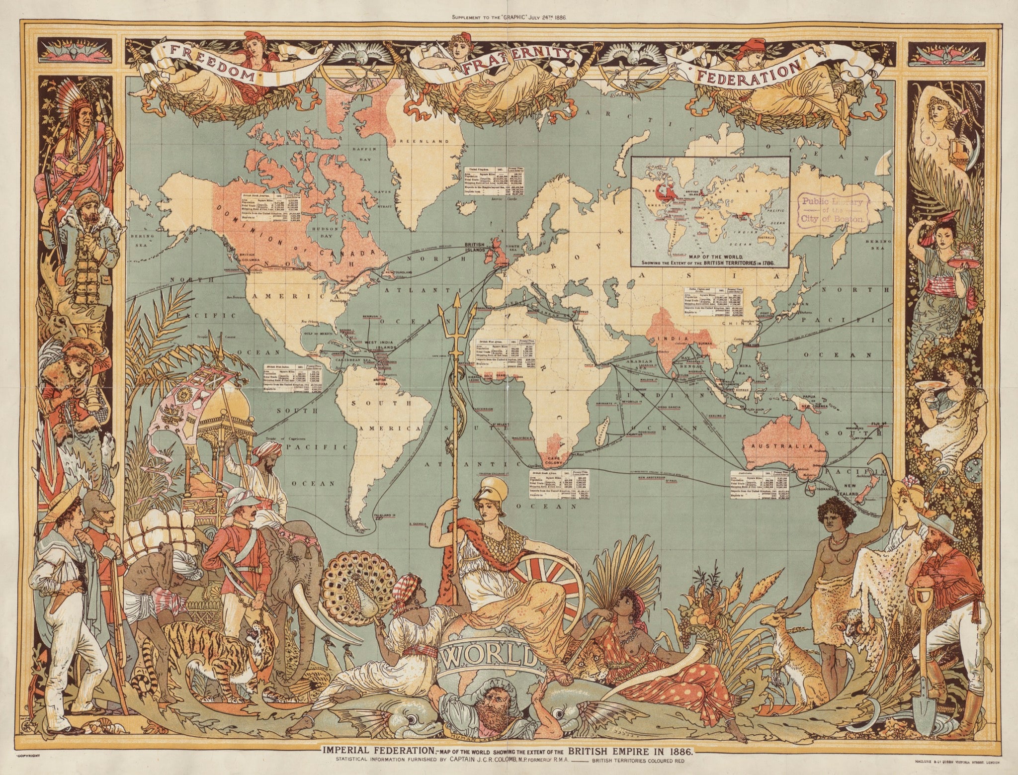 Map of the World showing the extent of the British Empire in 1886. Scenes of colonialism and ethnic stereotypes frame a triumpant Queen Victoria, who is depicted as Athena, resting on a globe which is carried on the shoulders of Atlas (who represents the empire's command over 'human labour'). Indigenous figures represent the subjugation of India, Africa, Canada and Australia British territories are shown in pink, linked by trade and immigration routes.