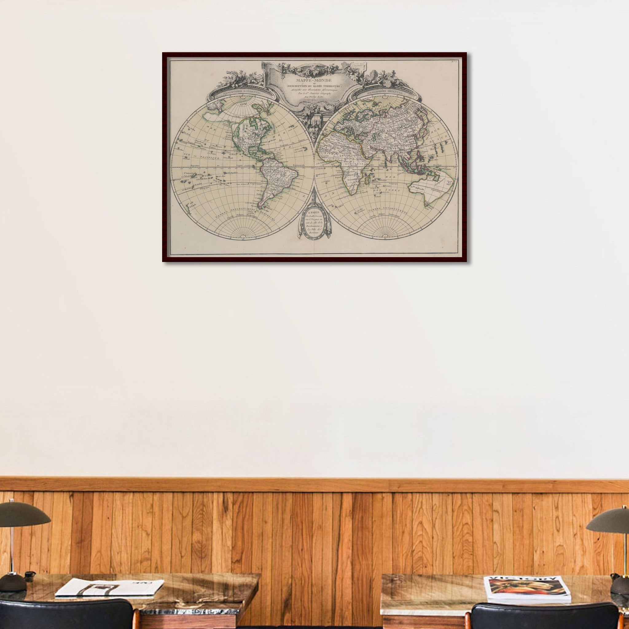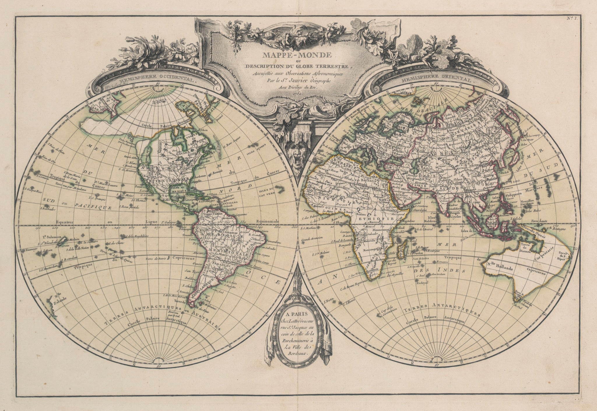 A French world map, providing a snap shot of the world known to Europeans in 1762 prior to Cooks voyage to confirm the east coast of New Holland. Fine neoclassical entablature from the period of Louis Sixteenth. From: Atlas Geographique contenant la Mappemonde et les quatre parties, avec les differents Etats, avec apprpbation & privilage du Roy MDCC.LXIII. A Paris,