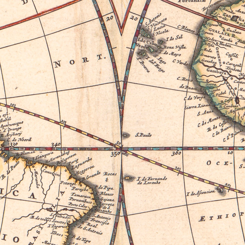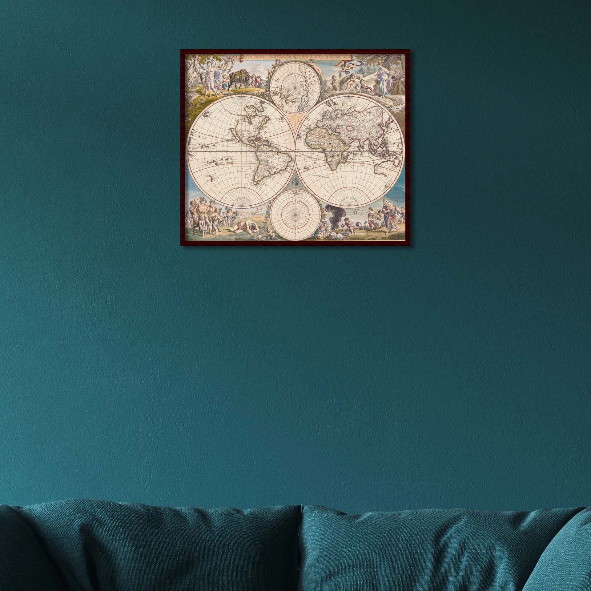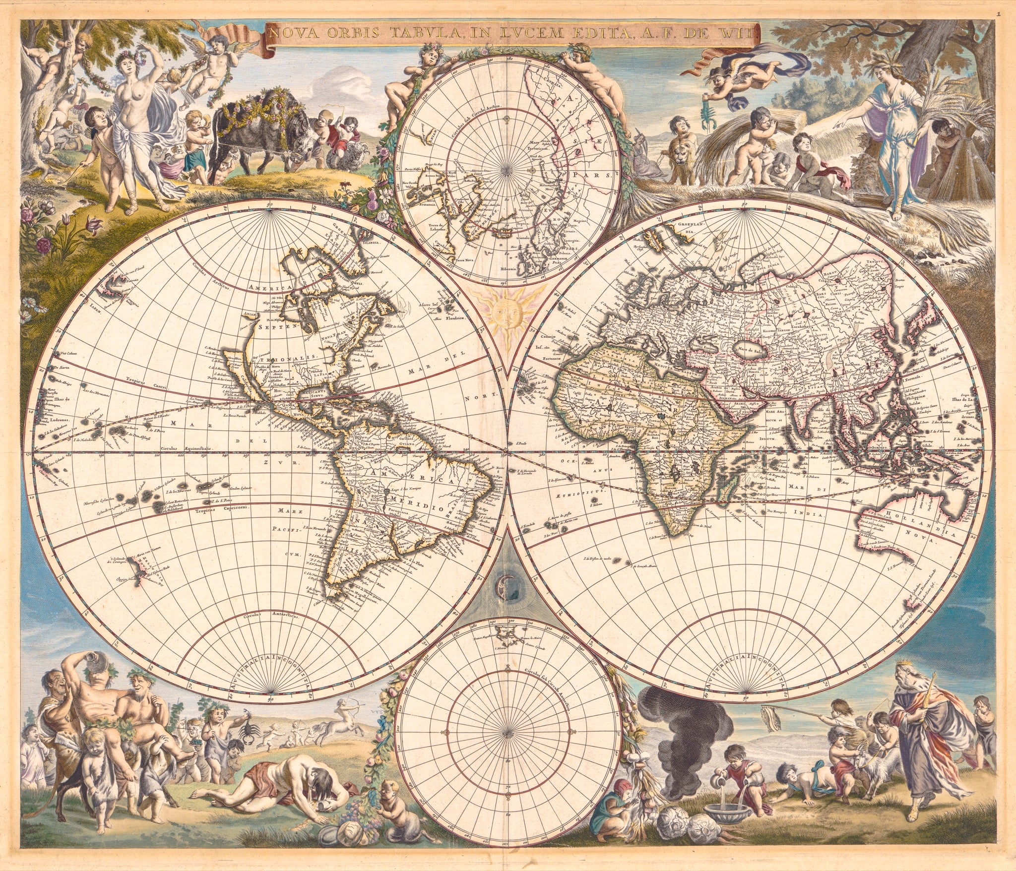 A classic double-hemisphere world map from the Dutch golden age of cartography, decorated with mythological scenes of the four seasons and the zodiac, bachanallias and abundant arcadian landscapes. The first outlines of Australia and New Zealand appear on European maps following Abel Tasman's voyages 1642-1644. The colouring is elegant and the engraver's draftsmanship very fine.