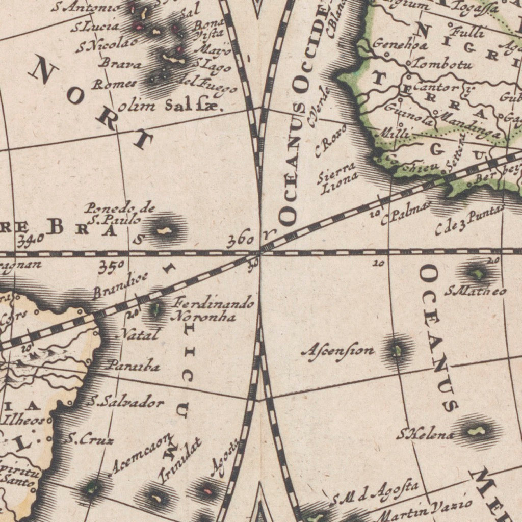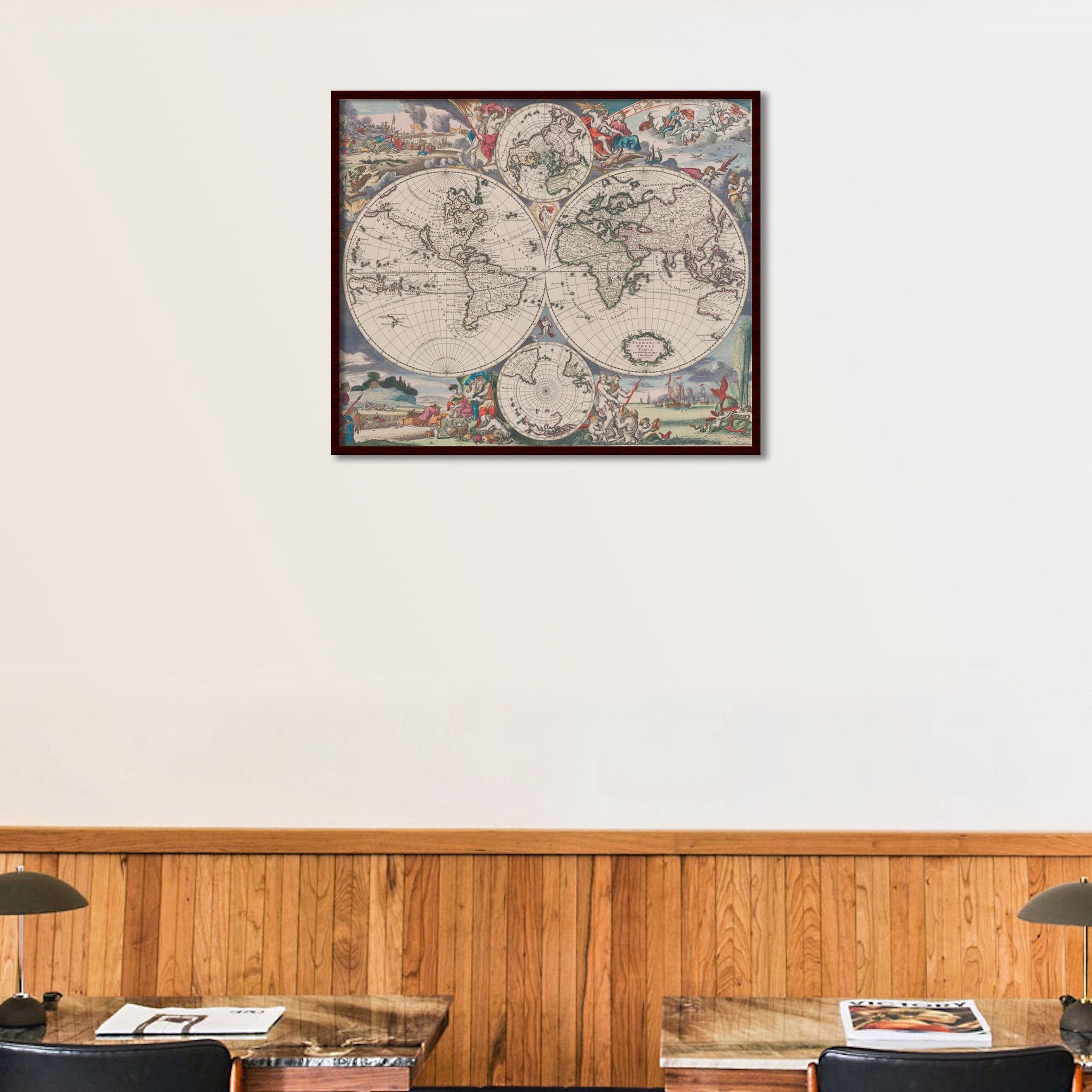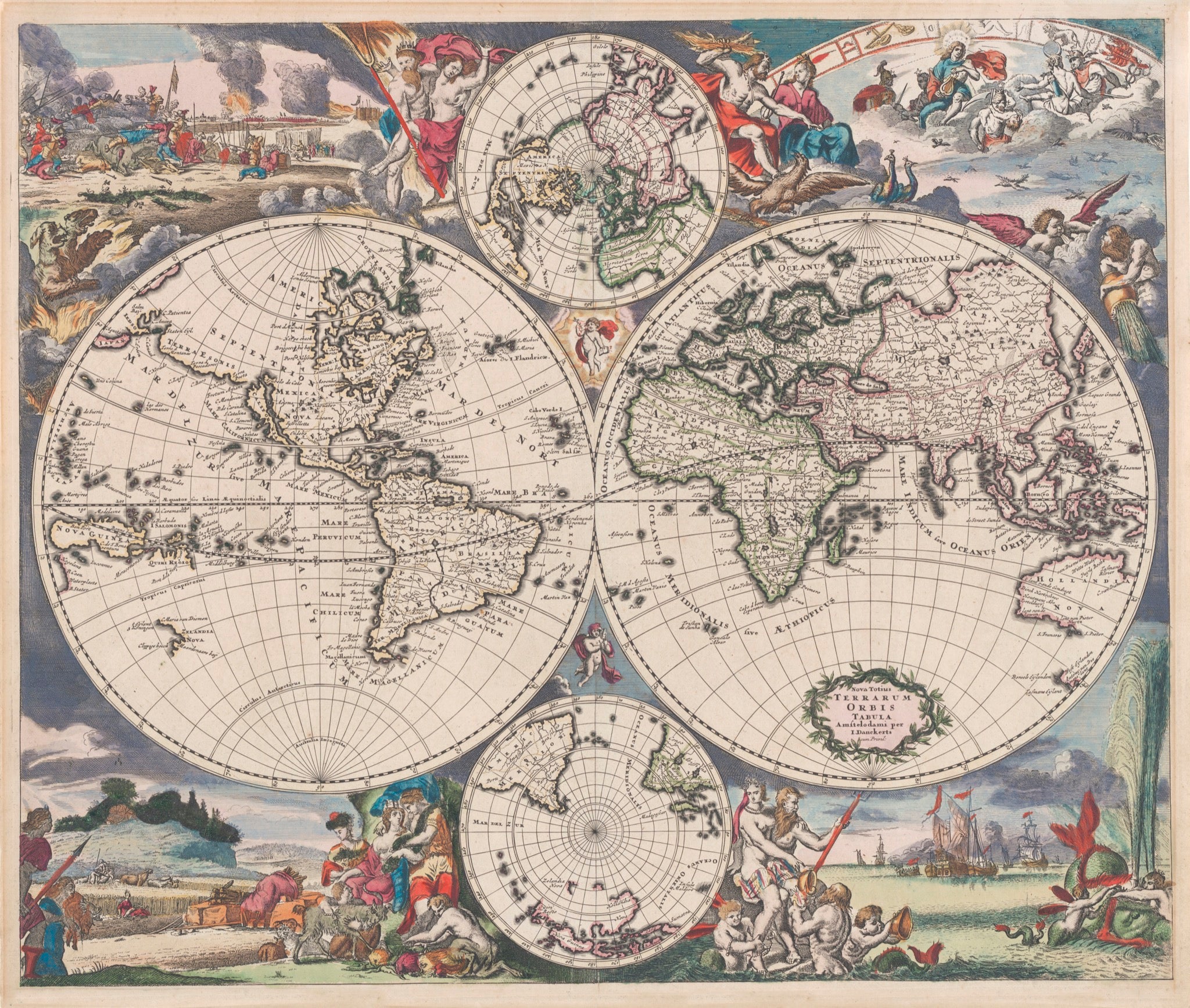 A great world map from the Dutch golden age of cartography, drawing heavily from De Wit's map of 1668. Surrounding the hemispheres are allegorical scenes of Fire, Air, Earth and Water. Fire is represented by war; Air by celestial beings in the clouds including figures of lightning, wind and rain. Earth is bountiful agriculture, and Water is shown as ships, a trident-bearing Poseidon,pearls and a whale spout.