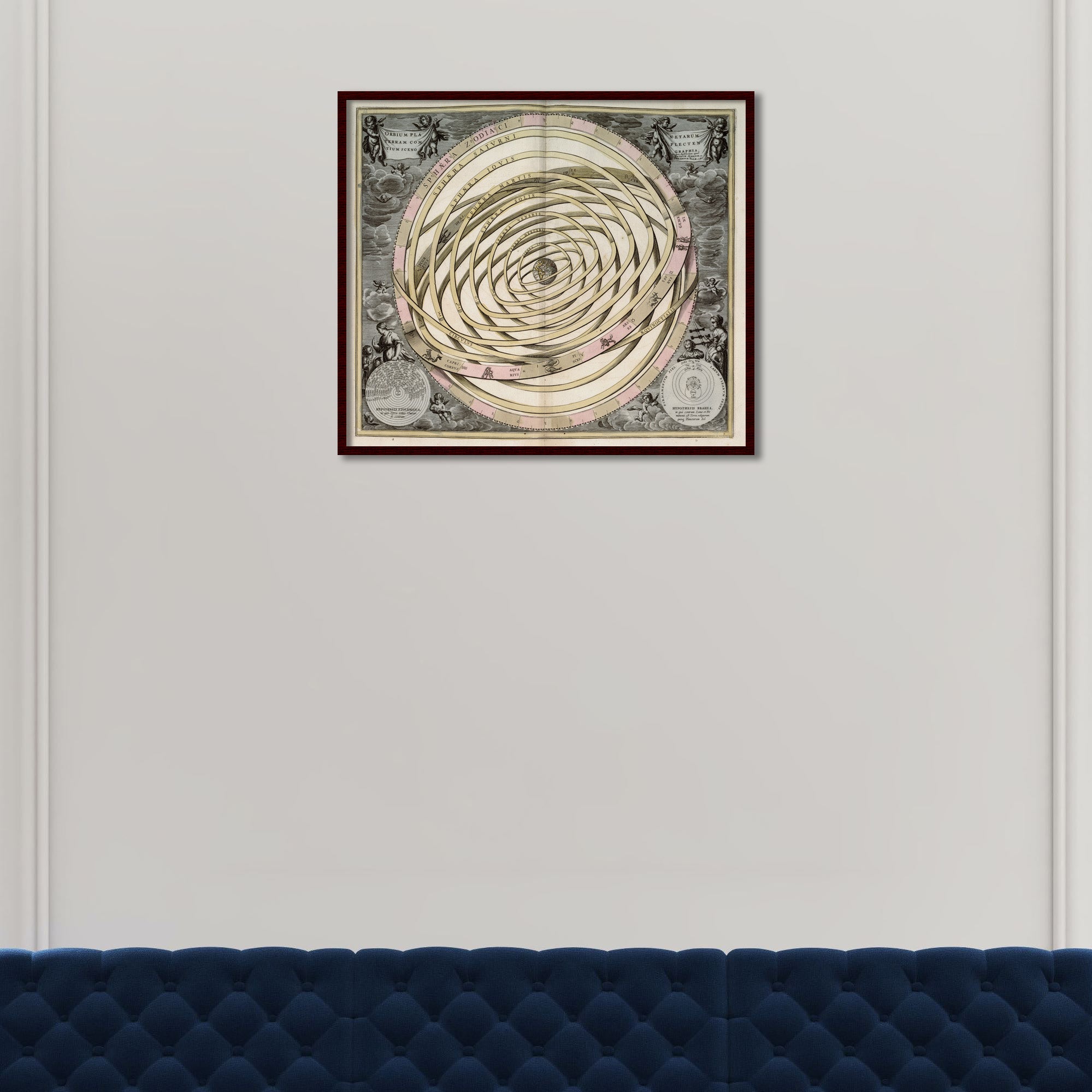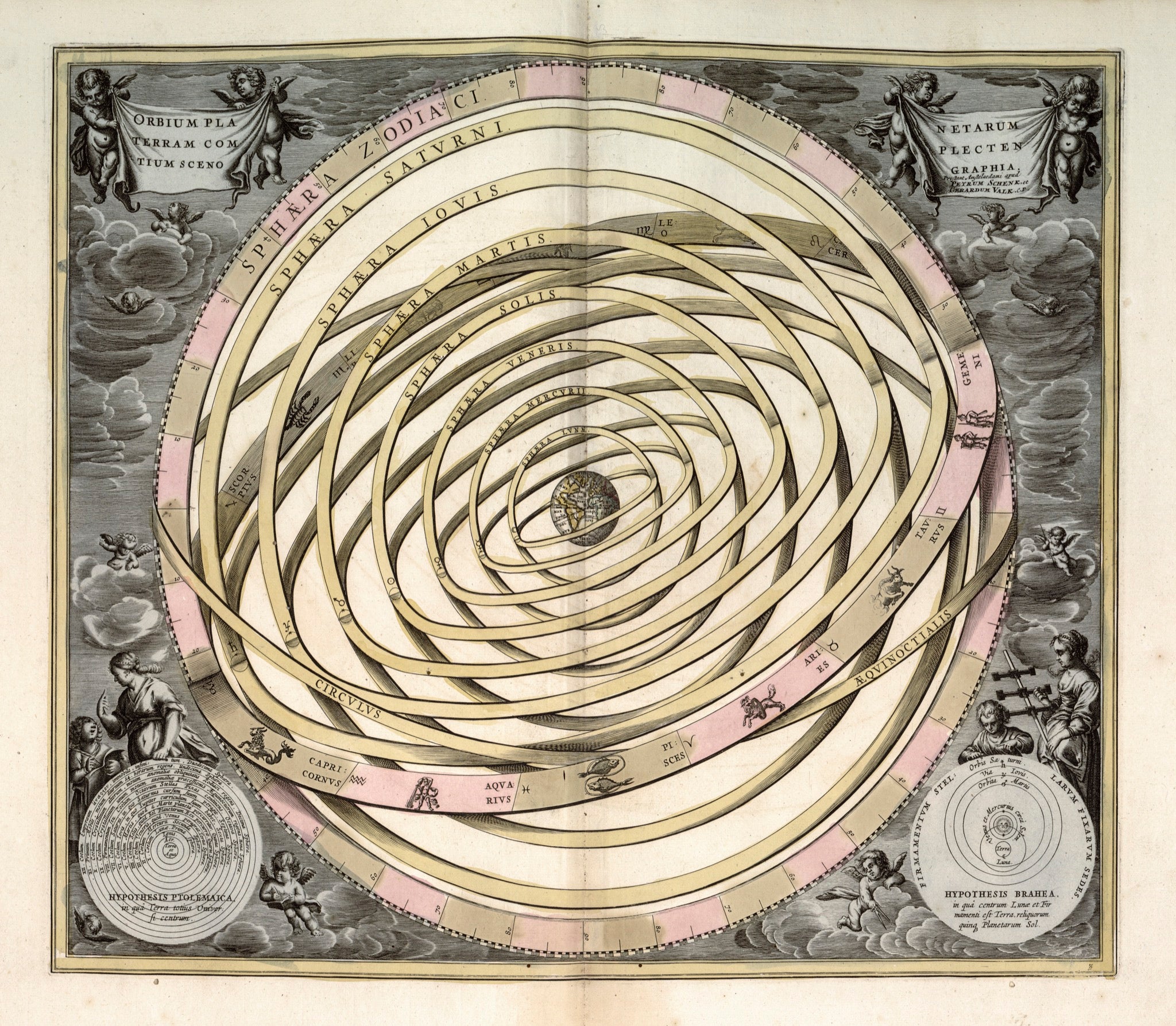 Celestial model of the Solar System with the Earth at the centre, showing movements of the planets, moon, sun and stars of the zodiac. This superb chart is from the Celestial Atlas of Universal Harmony (Atlas coelestis; seu Harmonia Macrocosmica), considered by many to be the most beautiful celestial atlas ever published.