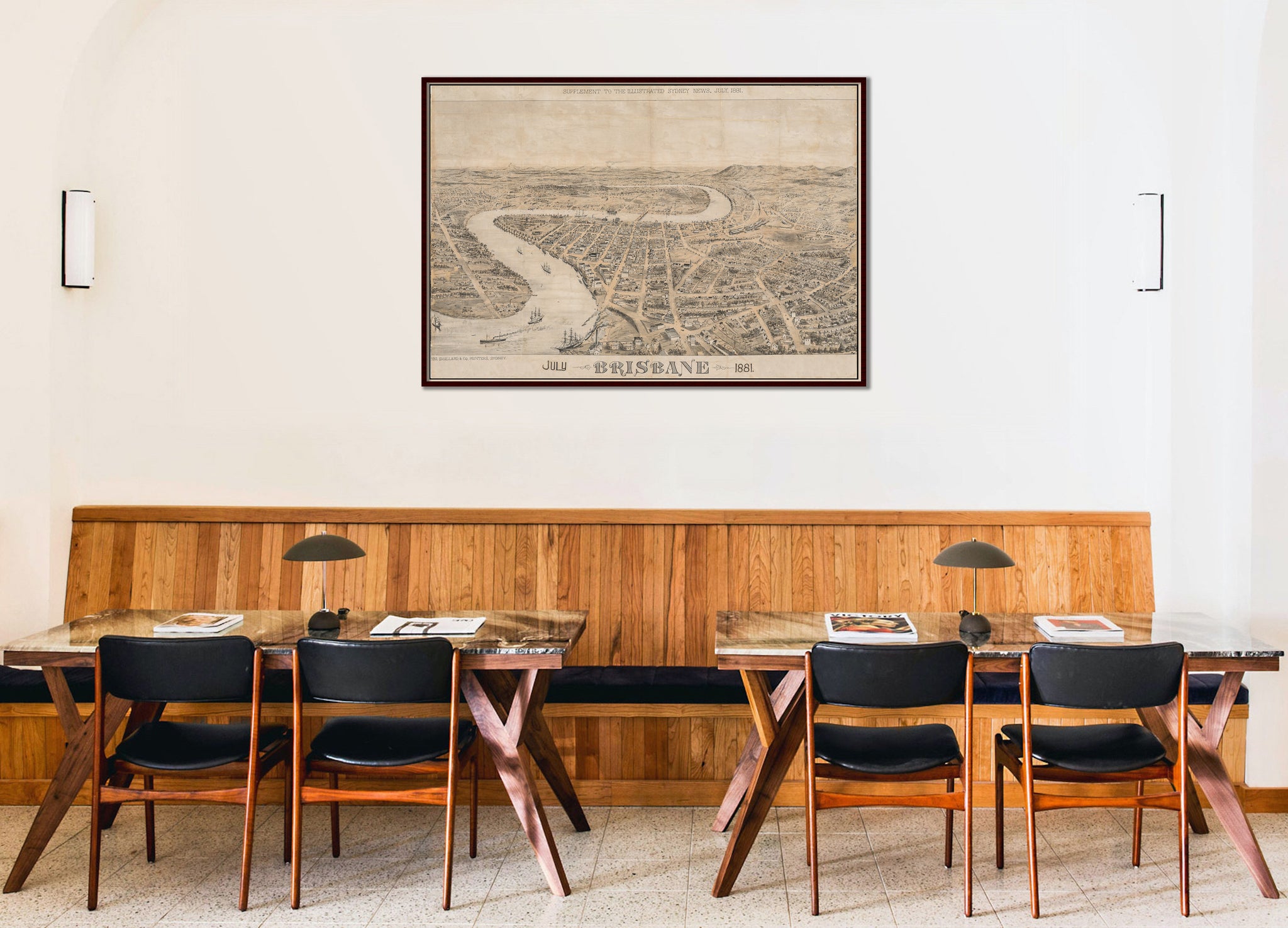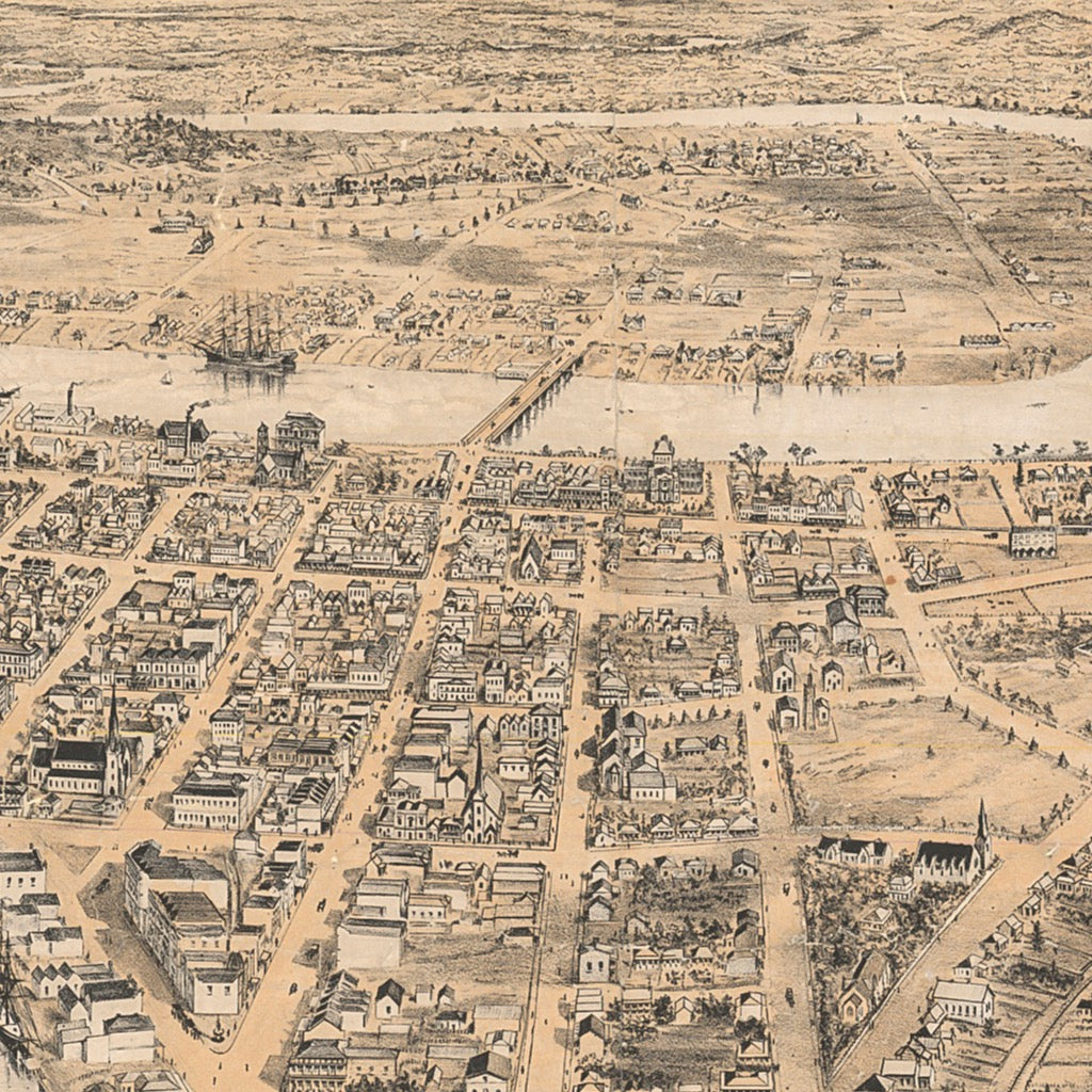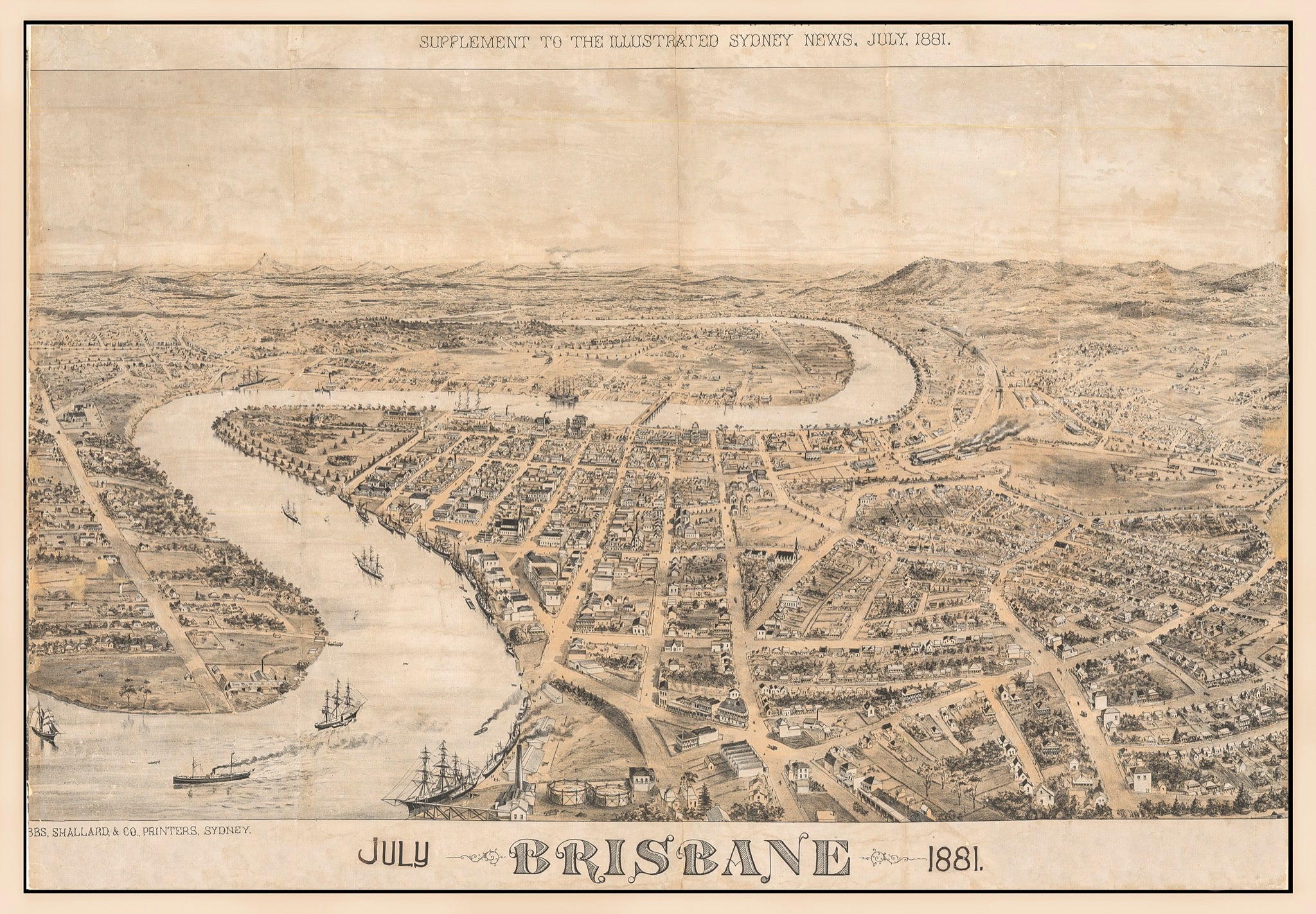 Detailed panoramic birdseye view of Brisbane, looking inland over the city centre, published in the 'Supplement to the Illustrated Sydney News, July, 1881'.
