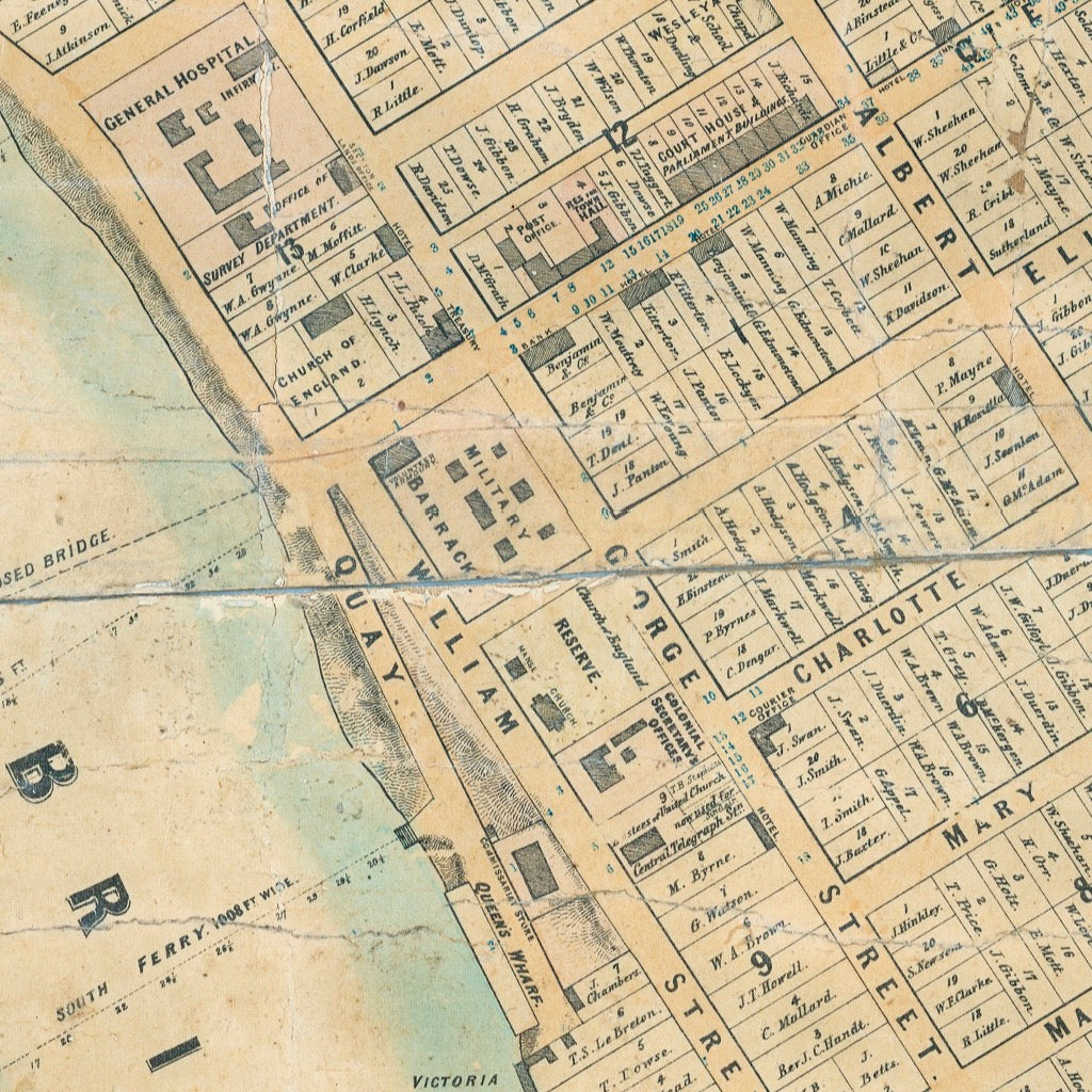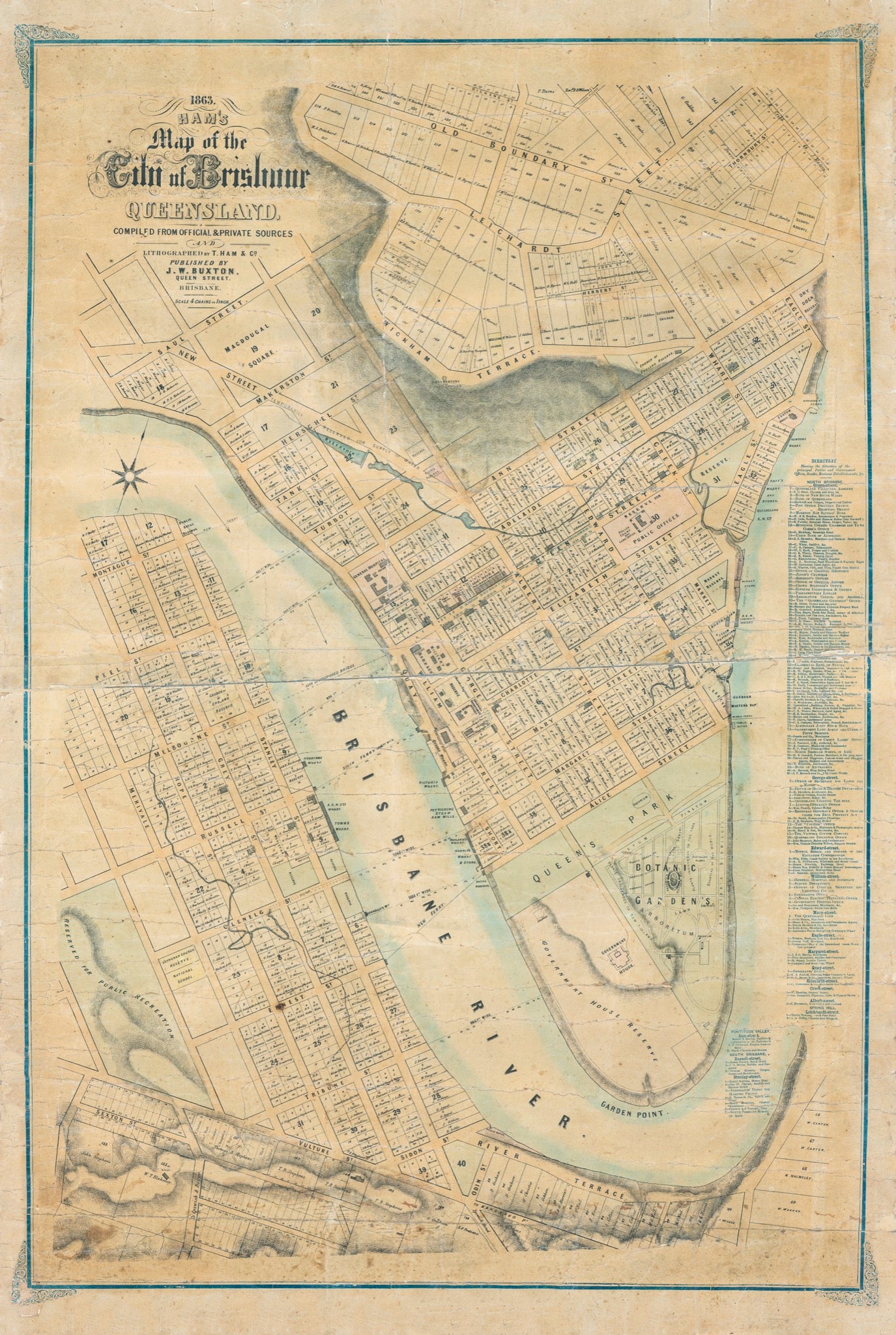 One of the best maps of colonial Brisbane, showing detailed information of the city's landmarks, early civic buildings, ferry crossings, businesses and names of private landowners for every block...The Brisbane Courier (July 1863) was impressed, proclaiming that: “As a work of art it reflects great credit upon the lithographers, Messrs T. Ham and Co., of George Street, and as a map for reference we can confidently recommend it… As it is published at a low price, it is only reasonable to expect that the new map will find its way into every place of business in the city, more especially as it has been published at great expense by a Brisbane firm.”