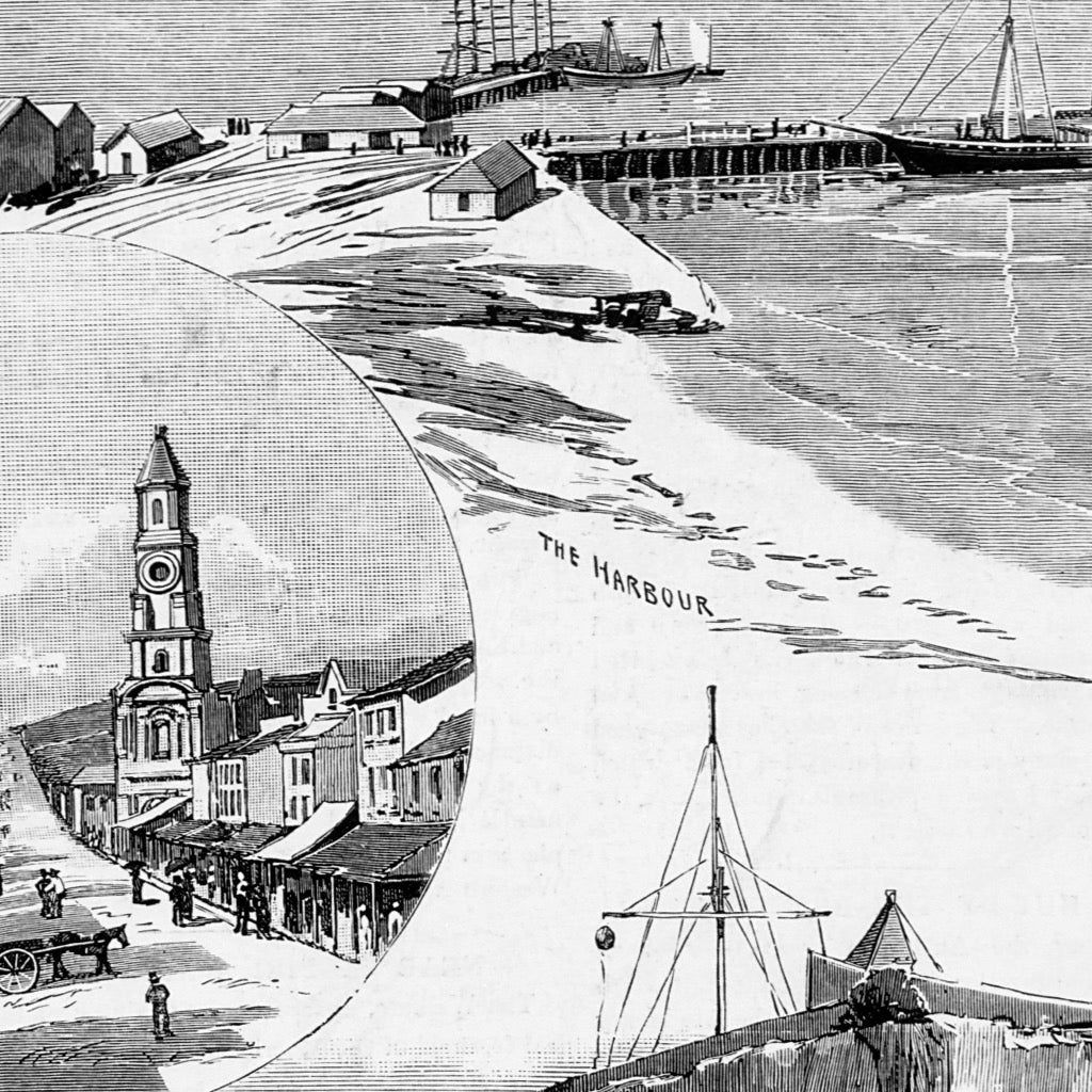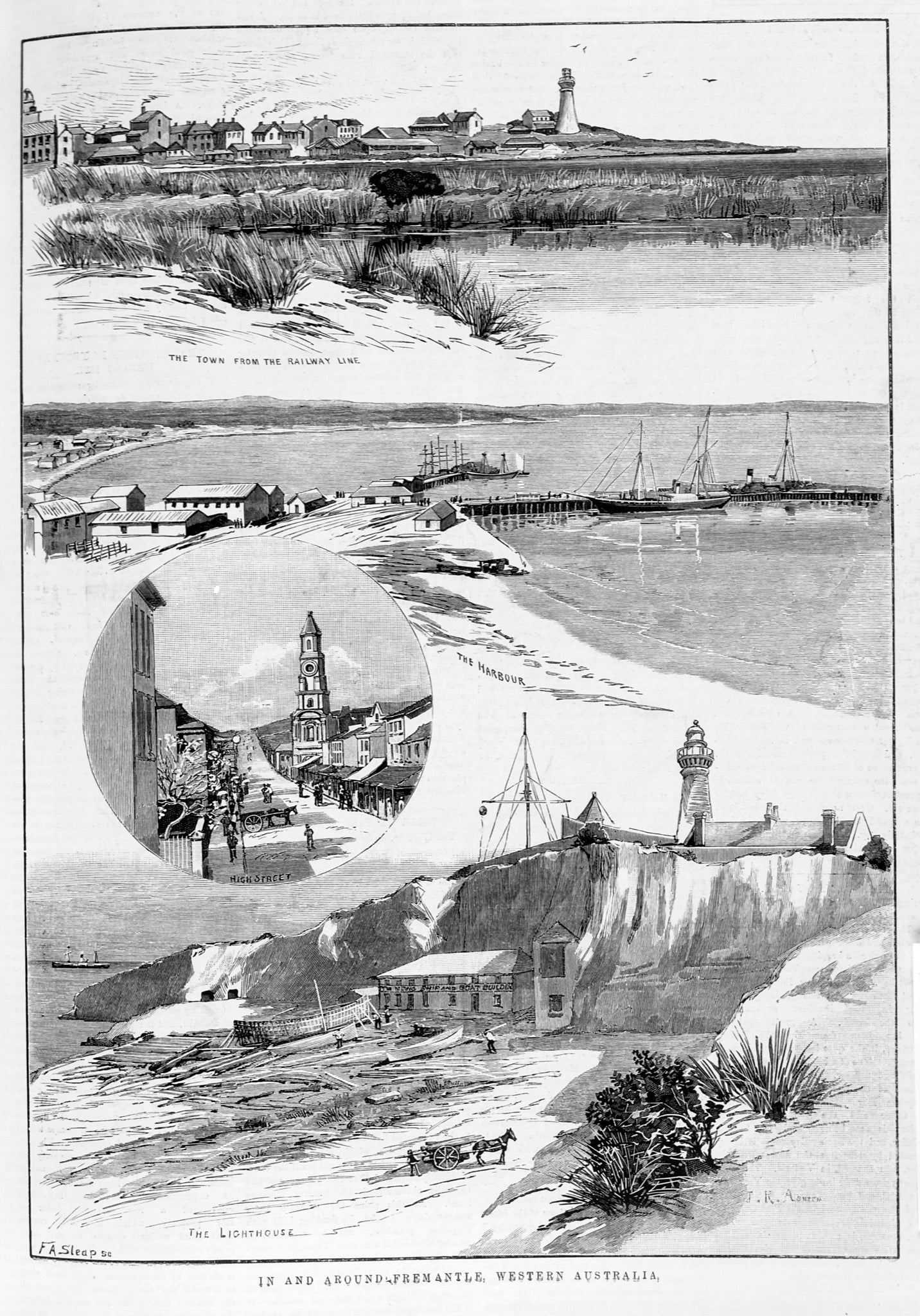 Lithographic poster with sights of Fremantle town, high street, harbour and lighthouse.