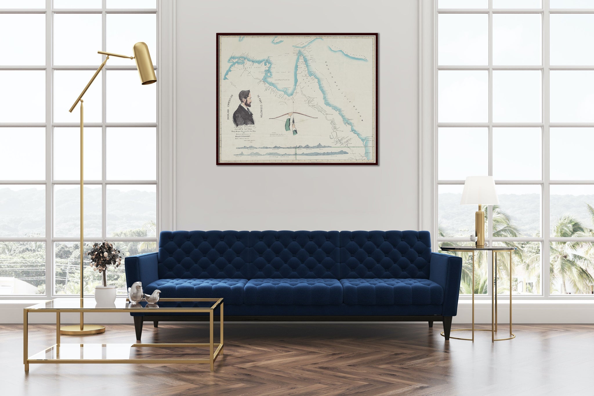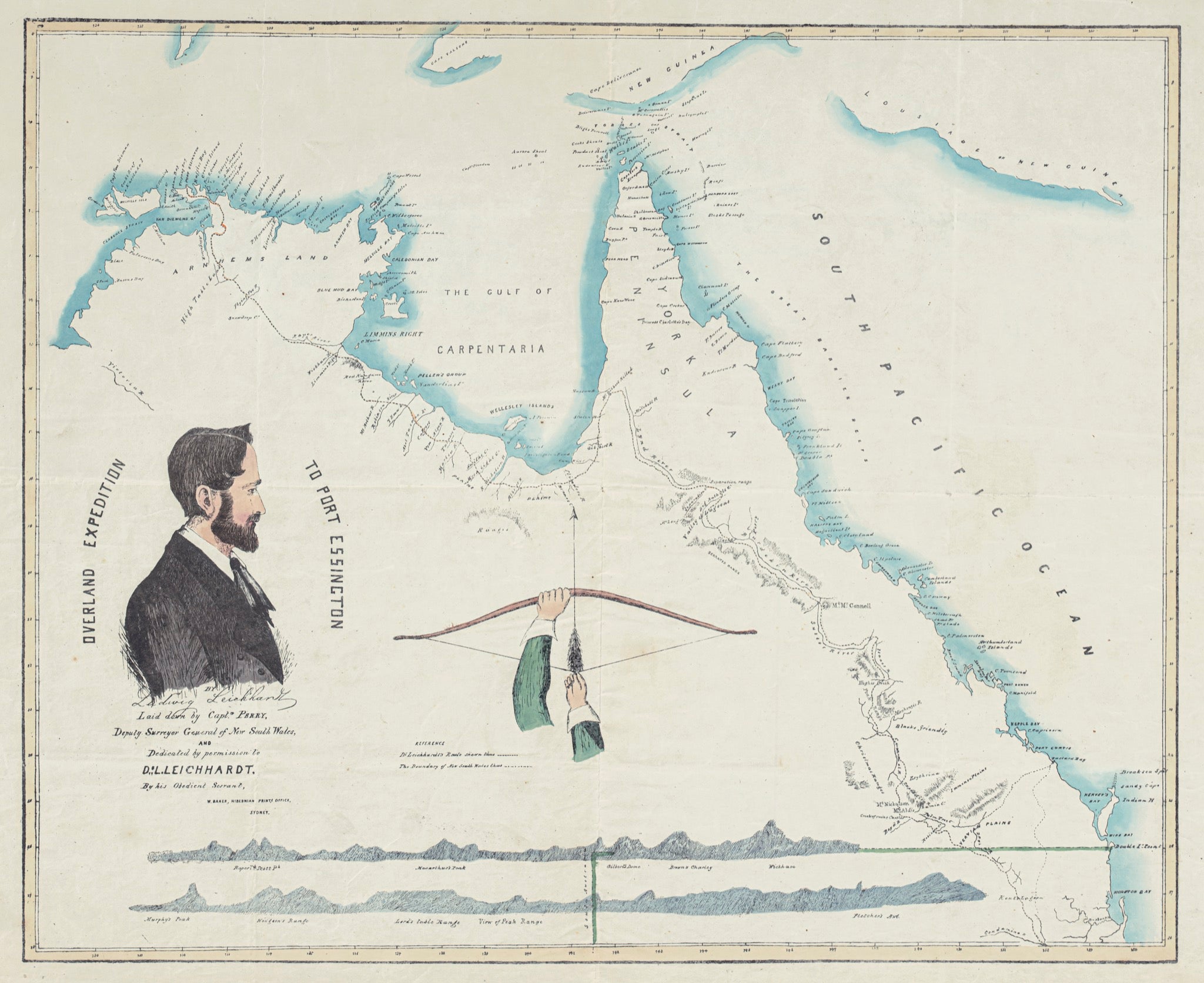 Ludwig Leichhardt, (1813-1848), having been given up for dead, defied the odds and successfully made the journey from the Darling Downs in Qld to Port Essington (Arnhem Land, NT)...On a later expedition, he was less fortunate, believed to have perished in the Simpson Desert while attempting to cross the continent from east to west. Patrick Whites’ novel Voss is based on the story...Archery bow represents north point. Portrait of Leichhardt and topographic profiles of route taken, also shown...Full title: ‘Map of Overland Expedition to Port Essington by Ludwig Leichhardt; laid down by Capt. Perry Deputy Surveyor General of New South Wales (1846)’.