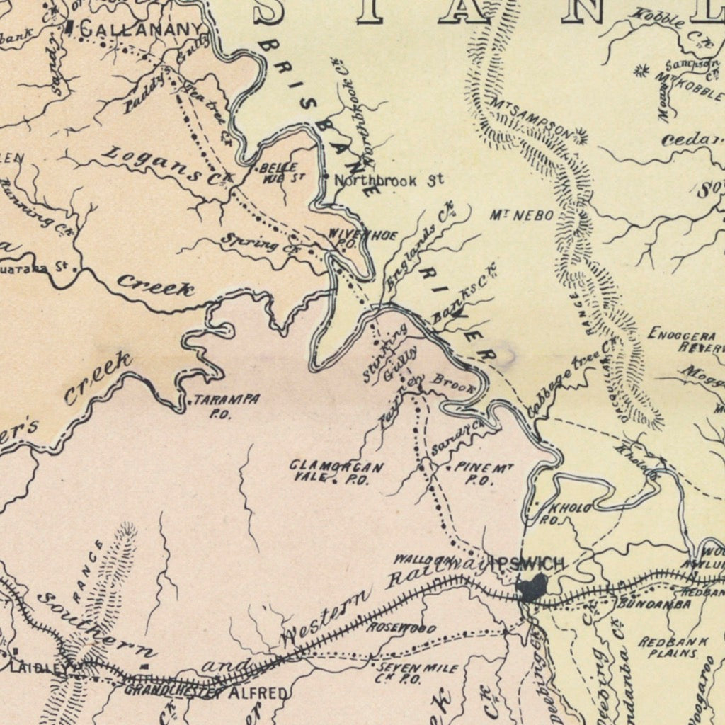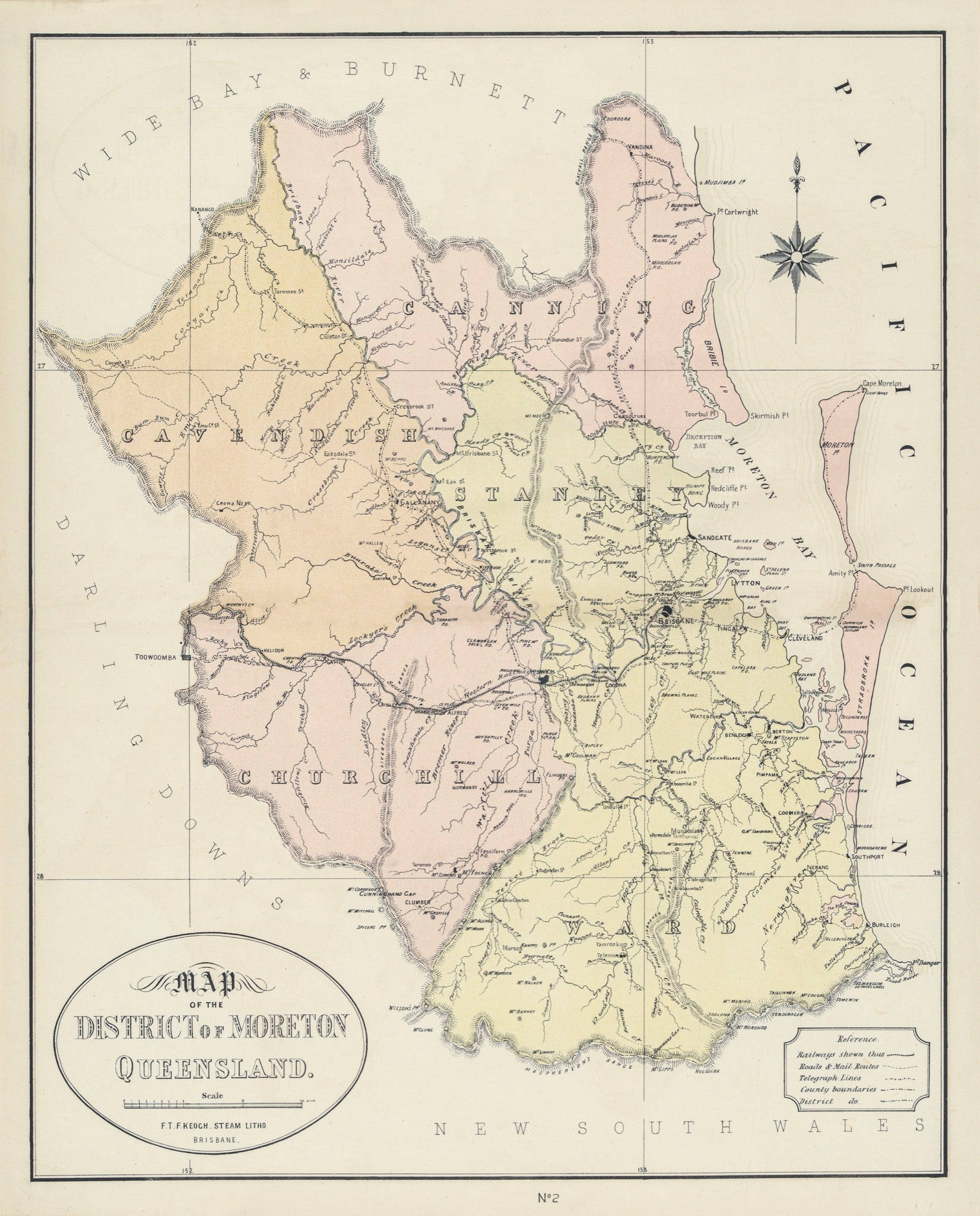 Map of the the area around Brisbane and the coast showing: Railways, Roads and Mail Routes, Telegraph lines, County and District Boundaries.
