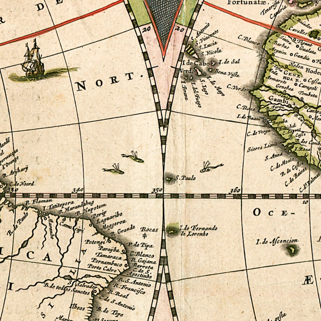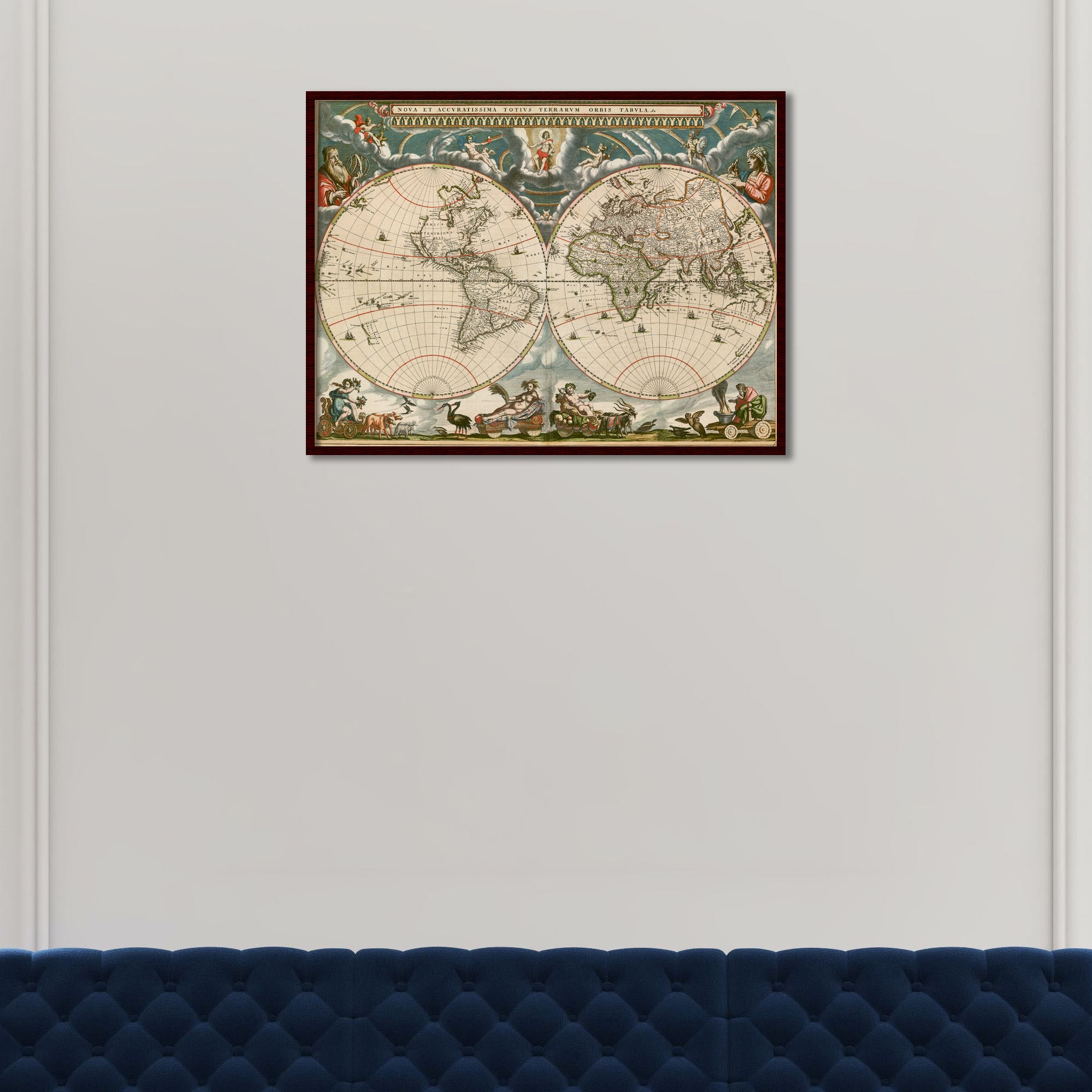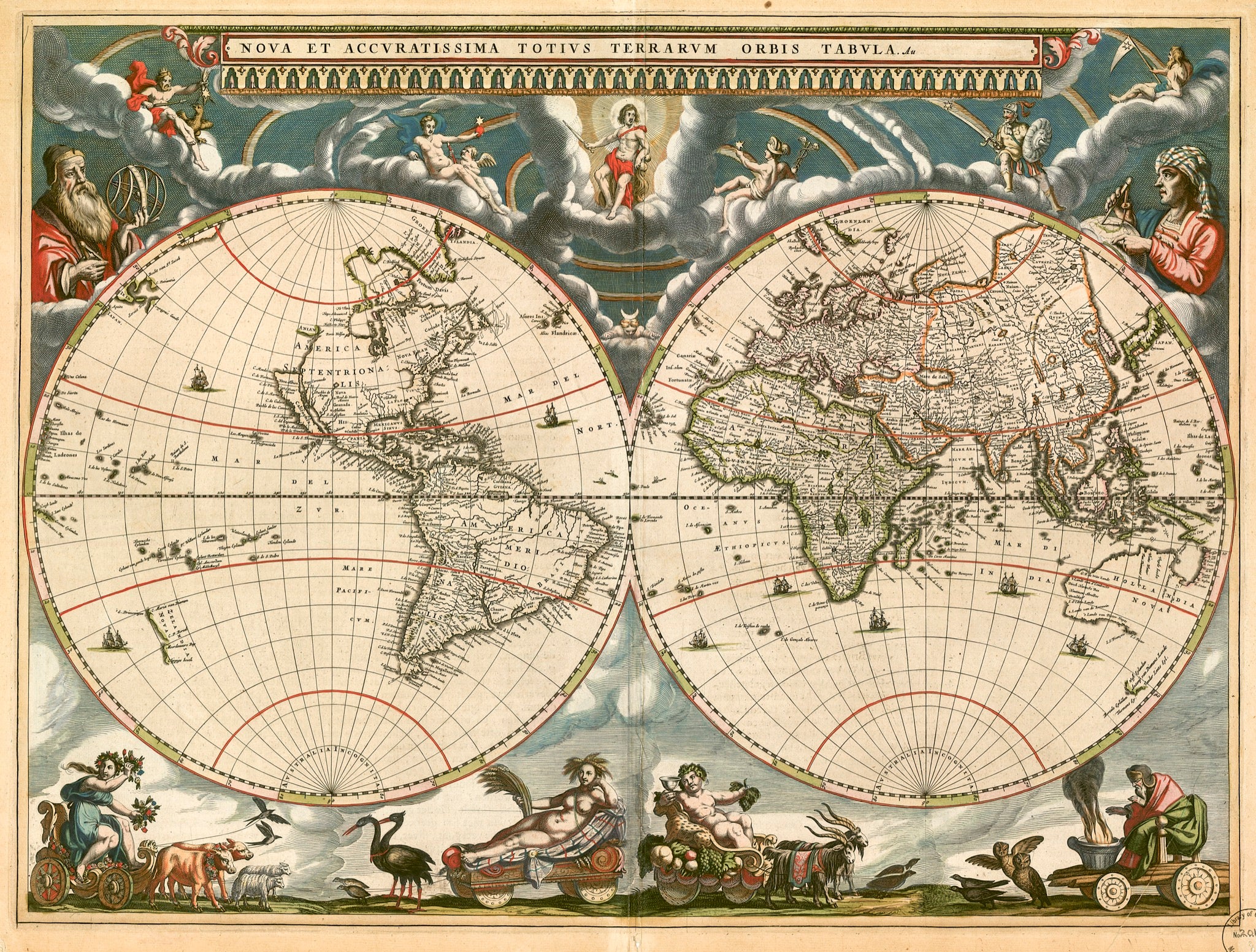 The Blaeu family were leading cartographers of the Dutch golden age, operating in Amsterdam. This elegant world map shows the Dutch discoveries around Australia, New Zealand and New Guinea following Abel Tasman's voyages of 1642-1644. Decorative mythical figures representing Spring, Summer, Autumn & Winter can be seen along the bond, and along the top of the map cartographers dwell in the clouds with other celestial gods.