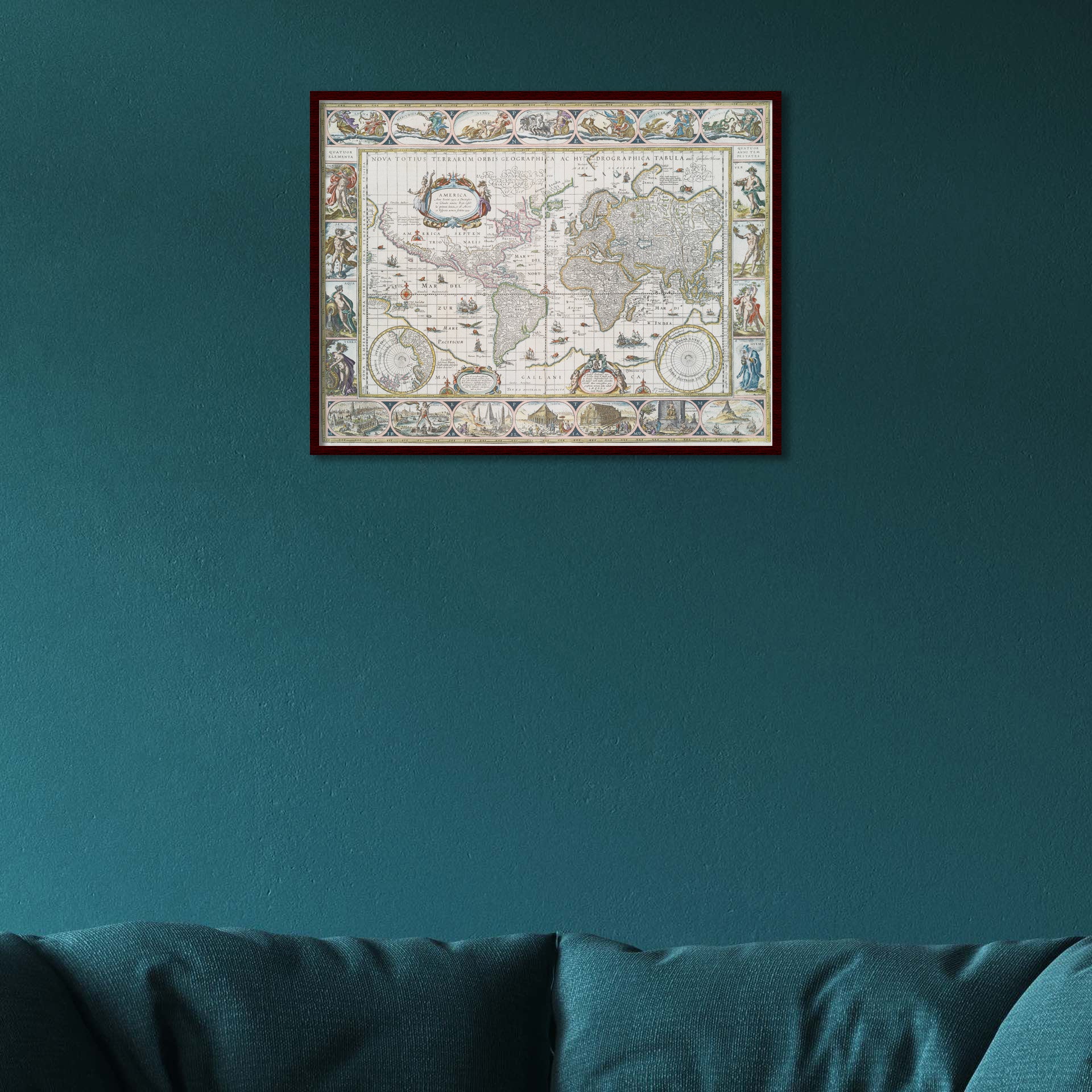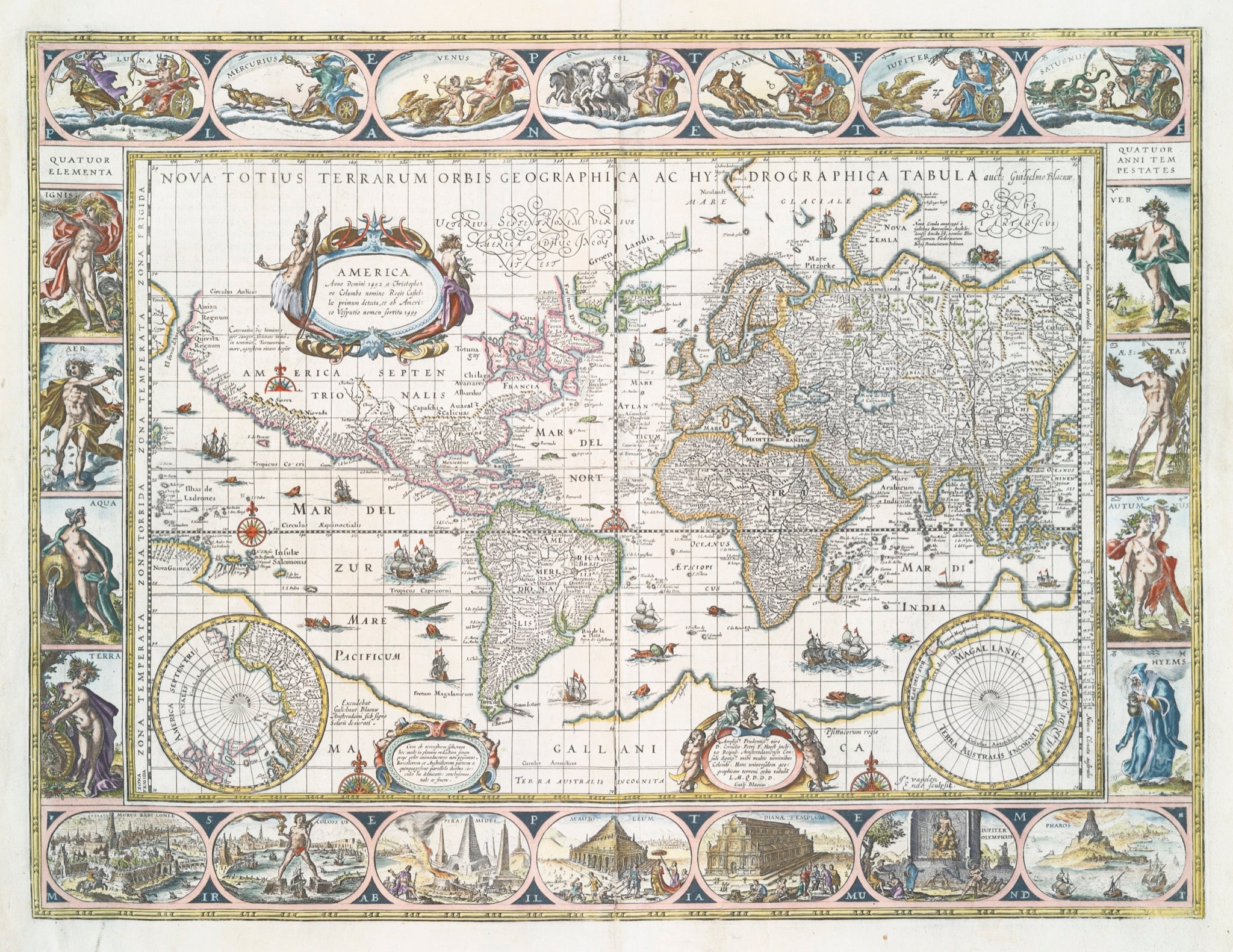 The Blaeu family were leading cartographers of the Dutch golden age. This world map is one of their master works. It predates Abel Tasman's discoveries of 1644 and shows the coast of Australia, suggestively referred to as 'Beach', as a vague projection (of Arnhem Land?) from the great southland 'Terra Australis Incognita'. The Gulf of Carpentaria and Cape York represent the recorded limits of the East Indies. The map is decorated with scenes of the wonders of the ancient world, and gods representing the planets, the seasons and earth, air, fire and water.