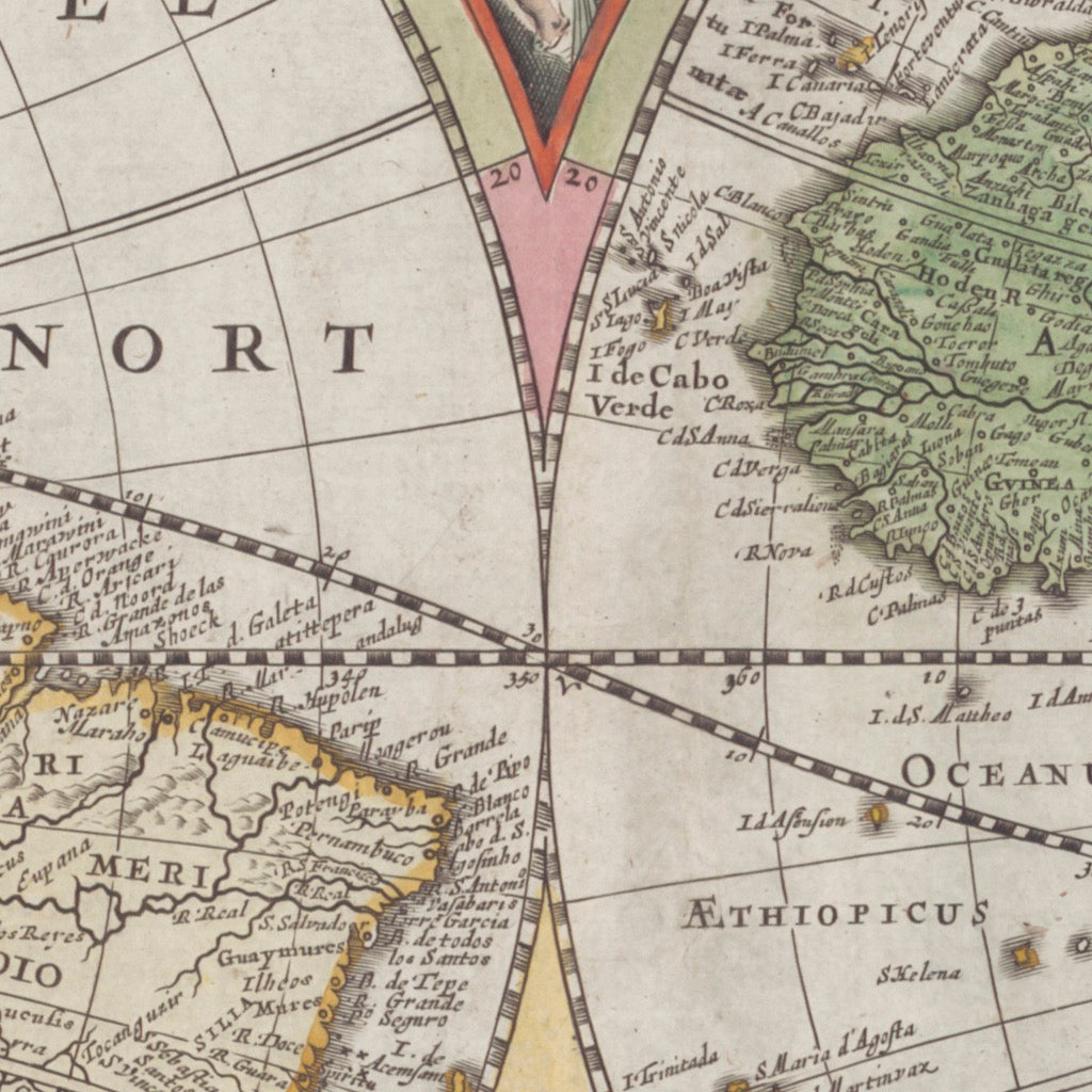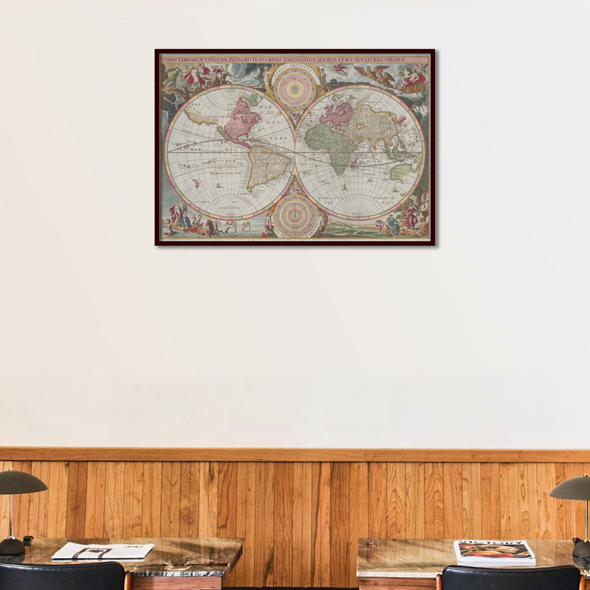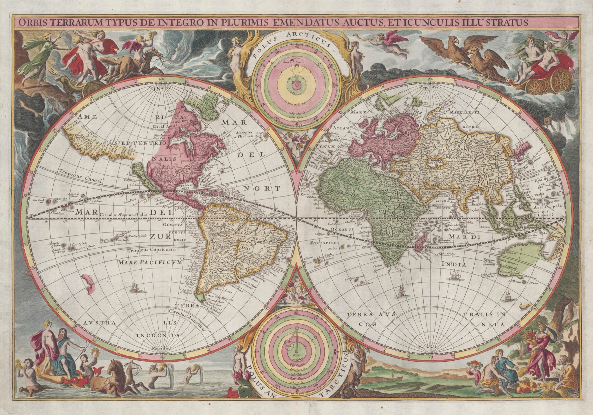 Double hemispherical world map showing results of Tasman's voyages in Australian and New Zealand waters. Published in the Dutch golden age of cartography.
