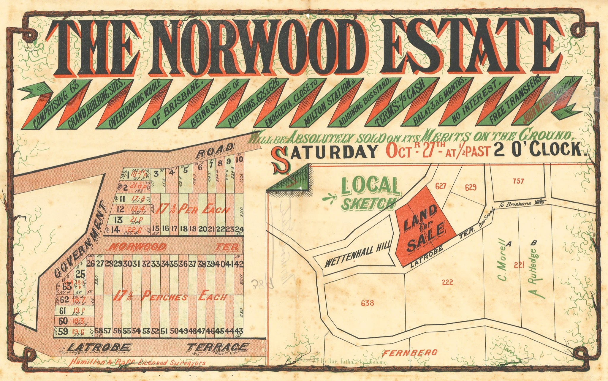 “The Norwood Estate is without exaggeration, the pinnacle of perfection as regards landed estates, situated on gradual rising ground, adjoining Wettenhall’s Hill. It overlooks the whole of Brisbane and its suburbs. The Norwood Estate has no bad smells, no fever-breeding swamps, but, on the contrary, it is the health resort of our citizens, and is in the midst of settlement, villa residences having sprung up all around during the last two years.” (Brisbane Courier, 24 October 1883)..- Comprising 62 grand building sites, overlooking the whole of Brisbane, ... Close to Milton Station & adjoining bus stand. (Incl. Norwood Terrace, Latrobe Terrace, Perrot Street, Gilday St and Tooth Ave).