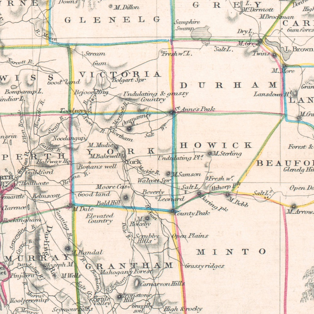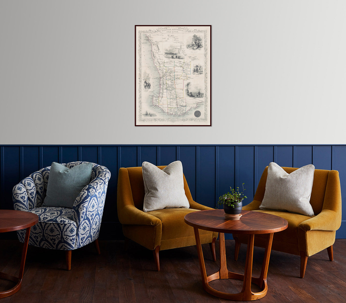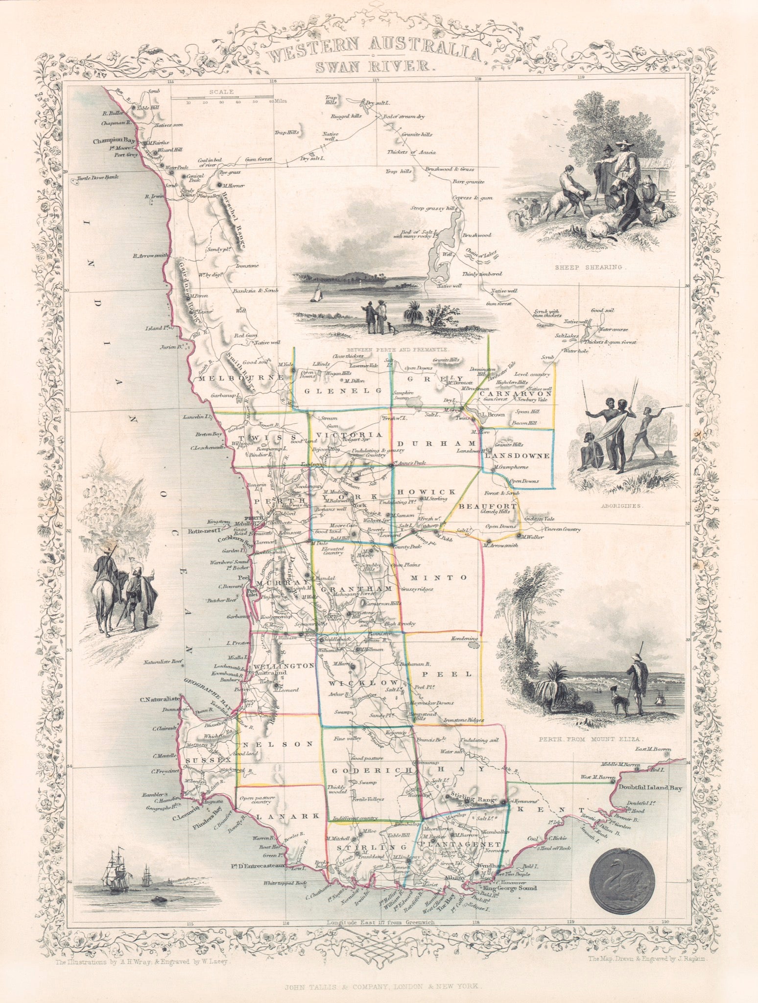 A fine decorative map of southwestern Western Australia from the popular Tallis': The Illustrated Atlas, And Modern History Of The World Geographical, Political, Commercial & Statistical, 1851; showing counties, roads and topography. Tallis maps are renowned for their illustrative vignettes, historical detail and ornate decorative borders.