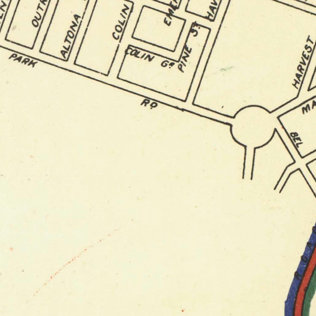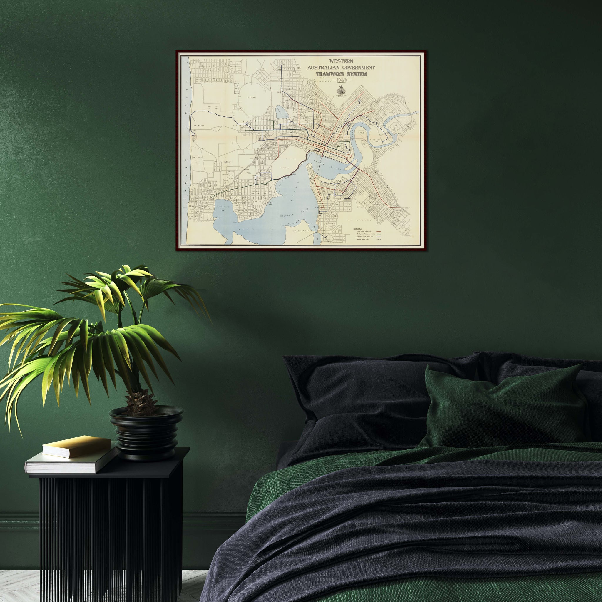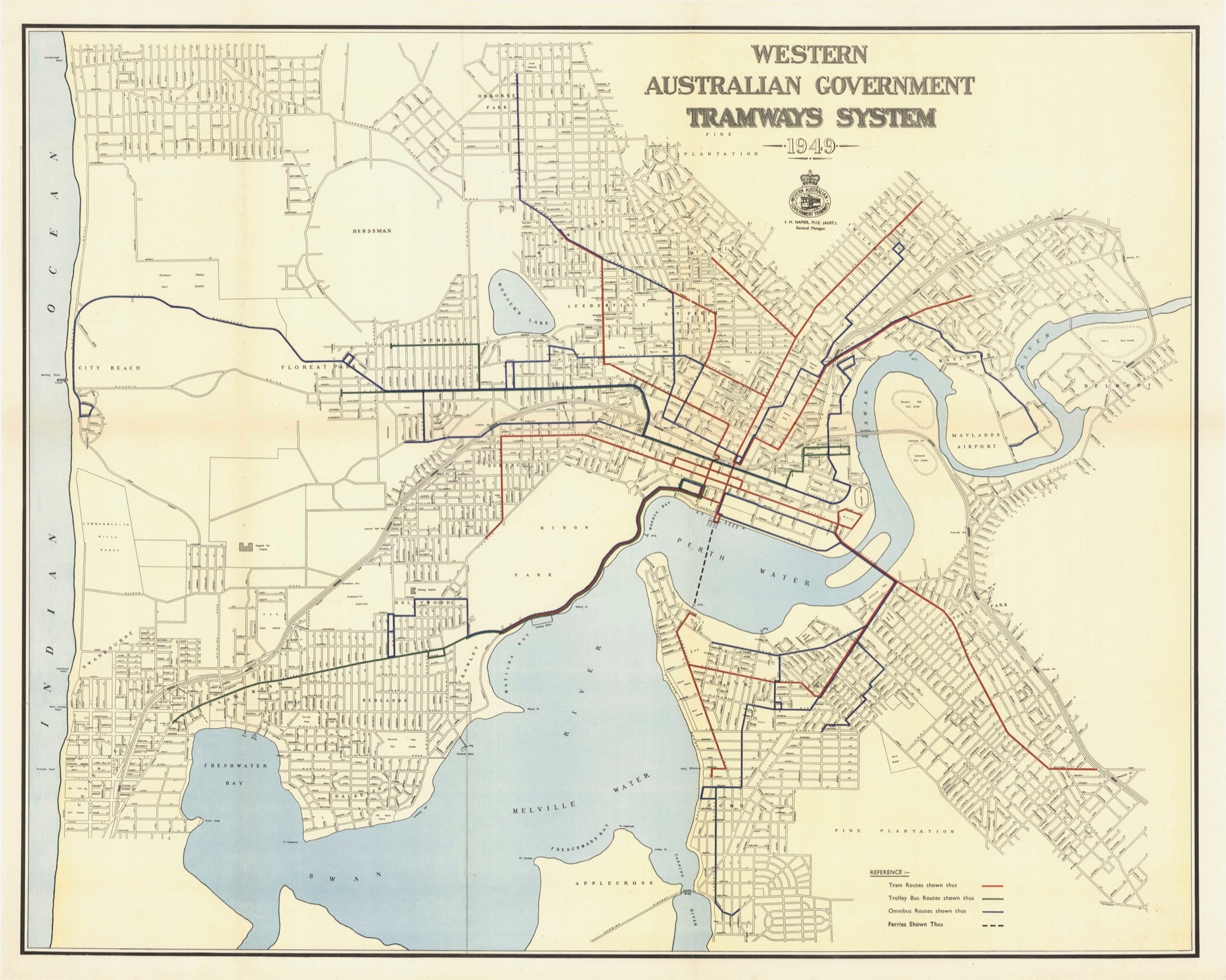 Transport map of Perth showing tram routes, trolley bus routes, omnibus routes, and ferries.